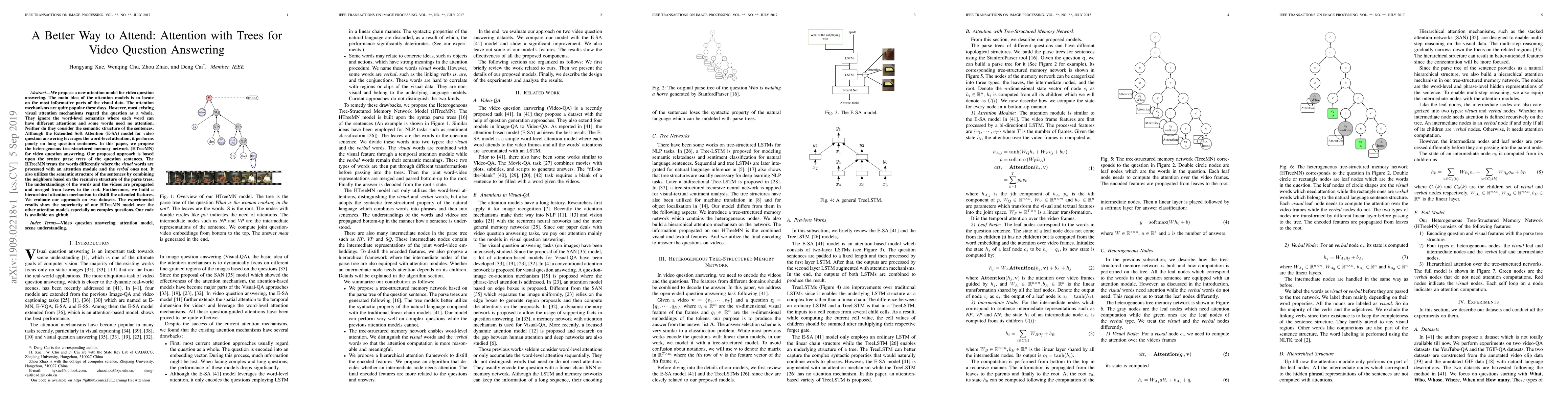 This paper proposes a heterogeneous tree-structured memory network (HTreeMN) for video question answering, addressing limitations of existing attention models by incorporating word-level attention and leveraging the semantic structure of questions through syntax parse trees. Experimental results demonstrate HTreeMN's superior performance on complex questions compared to other models.
