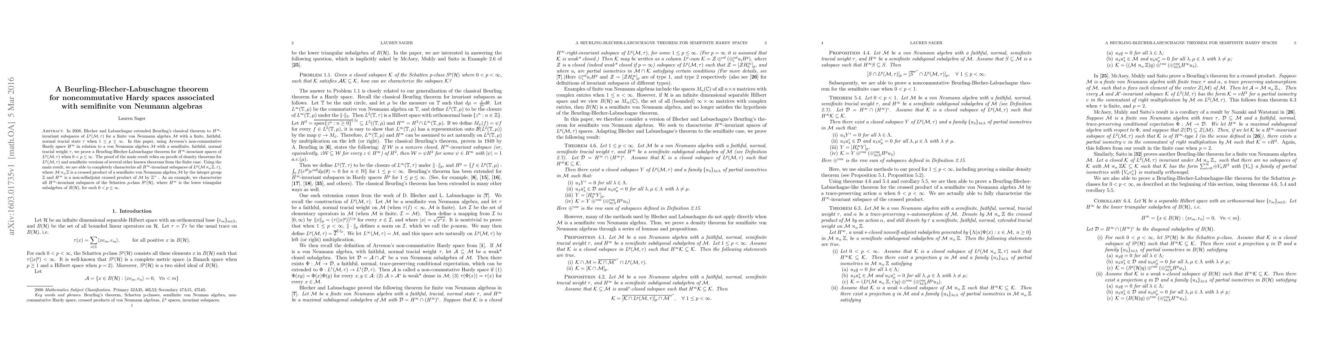 This paper extends Beurling's theorem to $H^\infty$-invariant subspaces in noncommutative Hardy spaces associated with semifinite von Neumann algebras, proving a Beurling-Blecher-Labuschagne theorem for $L^p(\mathcal{M},\tau)$ when $0<p\leq\infty$. The result characterizes all $H^\infty$-invariant subspaces of $L^p(\mathcal M\rtimes_\alpha \mathbb Z,\tau)$ and $S^p(\mathcal{H})$.