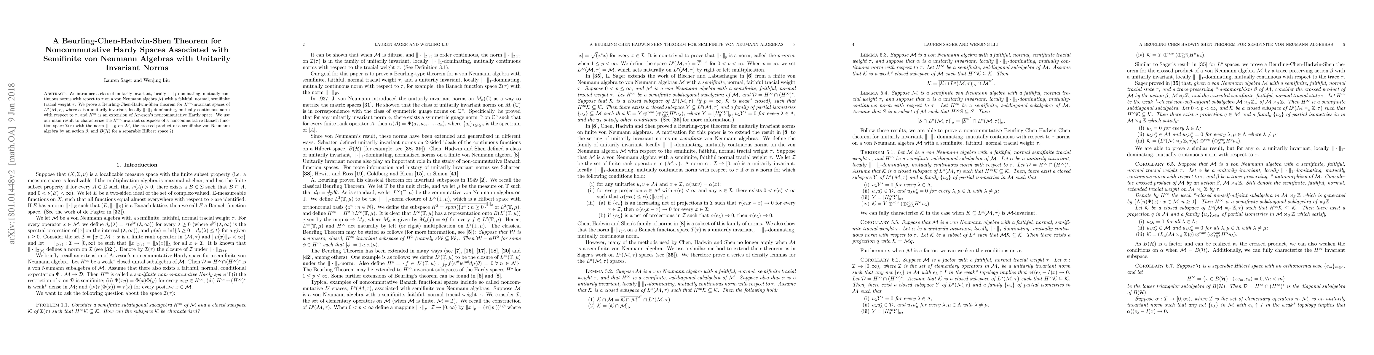 We introduce a class of unitarily invariant, locally $\|\cdot\|_1$-dominating, mutually continuous norms with repect to $\tau$ on a von Neumann algebra $\mathcal{M}$ with a faithful, normal, semifinite tracial weight $\tau$. We prove a Beurling-Chen-Hadwin-Shen theorem for $H^\infty$-invariant spaces of $L^\alpha(\mathcal{M},\tau)$, where $\alpha$ is a unitarily invariant, locally $\|\cdot\|_1$-dominating, mutually continuous norm with respect to $\tau$, and $H^\infty$ is an extension of Arveson's noncommutative Hardy space. We use our main result to characterize the $H^\infty$-invariant subspaces of a noncommutative Banach function space $\mathcal I(\tau)$ with the norm $\|\cdot\|_{E }$ on $\mathcal{M}$, the crossed product of a semifinite von Neumann algebra by an action $\beta$, and $B(\mathcal{H})$ for a separable Hilbert space $\mathcal{H}$.