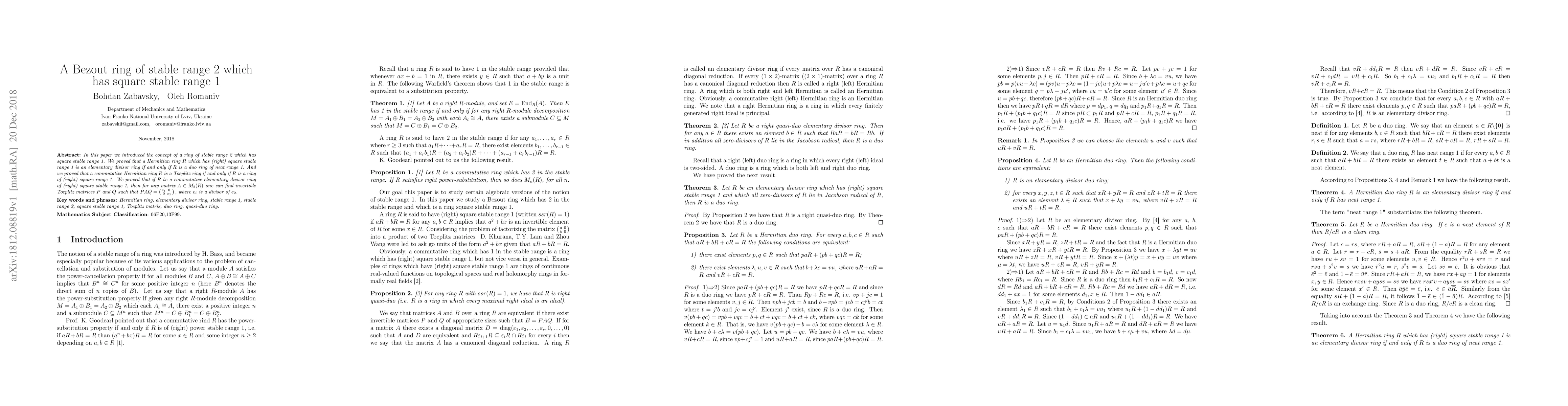 The paper introduces and analyzes the concept of a ring of stable range 2 that also has square stable range 1, proving properties related to elementary divisor rings, duo rings, and Hermitian rings.