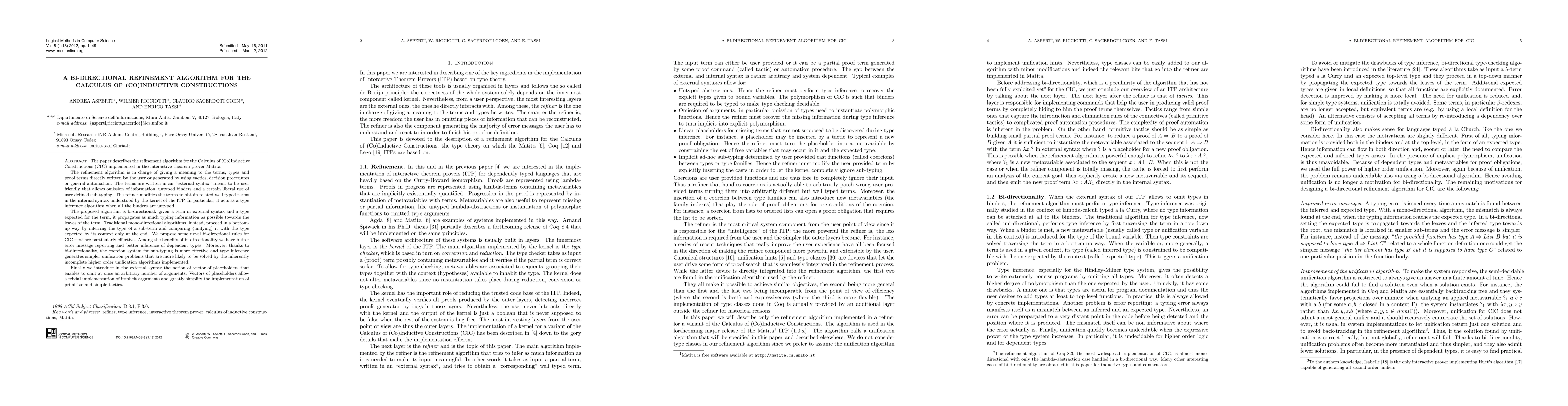 The paper presents a bi-directional refinement algorithm for the Calculus of (Co)Inductive Constructions (CIC) in the interactive theorem prover Matita, enhancing type inference and error reporting through bi-directional type propagation. It also introduces vectors of placeholders for simplifying tactic implementations and implicit arguments.