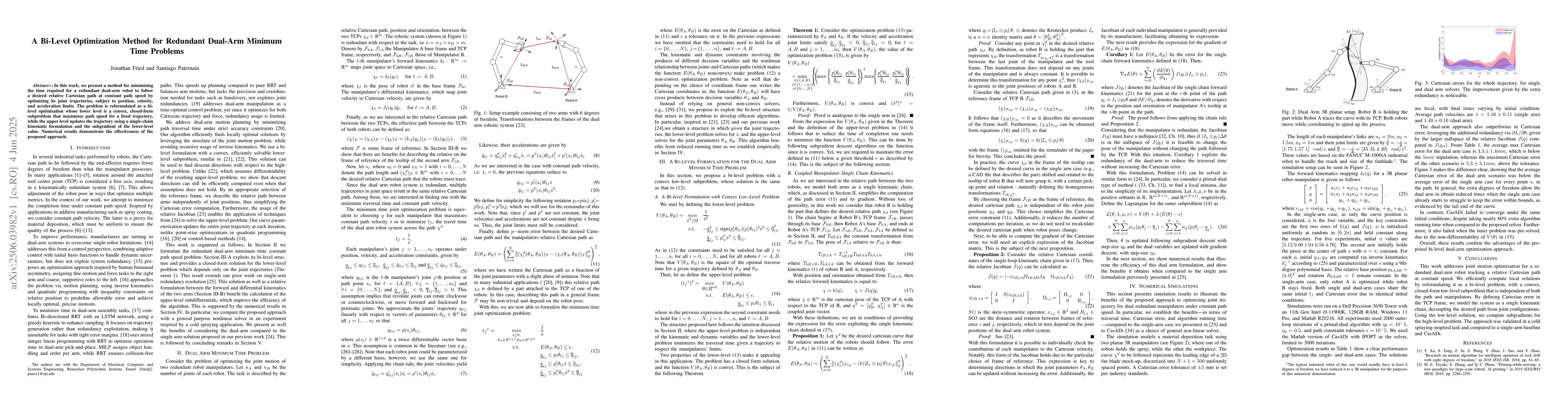 The paper presents a bi-level optimization method for redundant dual-arm robots, focusing on minimizing time to follow a desired path with constant speed, subject to position, velocity, and acceleration limits. The lower level is a convex, closed-form subproblem maximizing path speed for a fixed trajectory, while the upper level updates the trajectory using a single-chain kinematic formulation and the subgradient of the lower-level value.