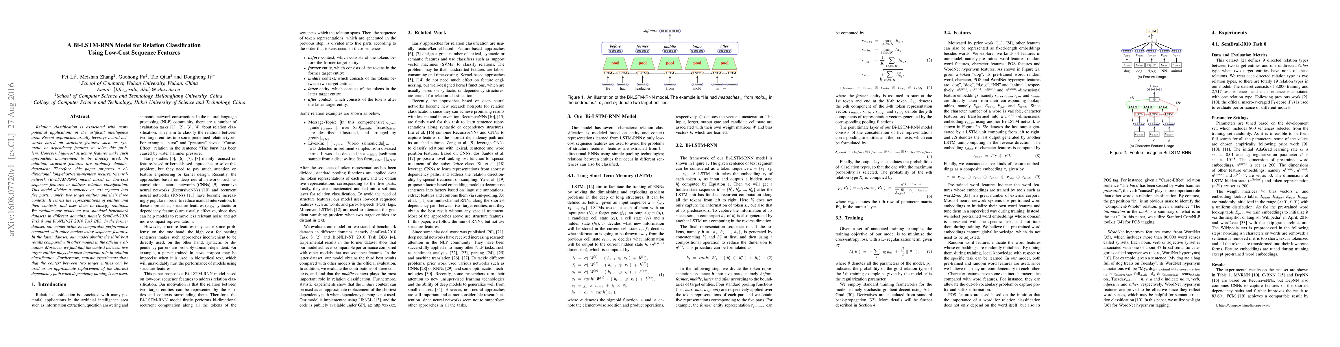 This paper proposes a Bi-LSTM-RNN model for relation classification using low-cost sequence features instead of high-cost structure features. The model divides sentences into five parts and achieves competitive performance on benchmark datasets, highlighting the importance of context between target entities.