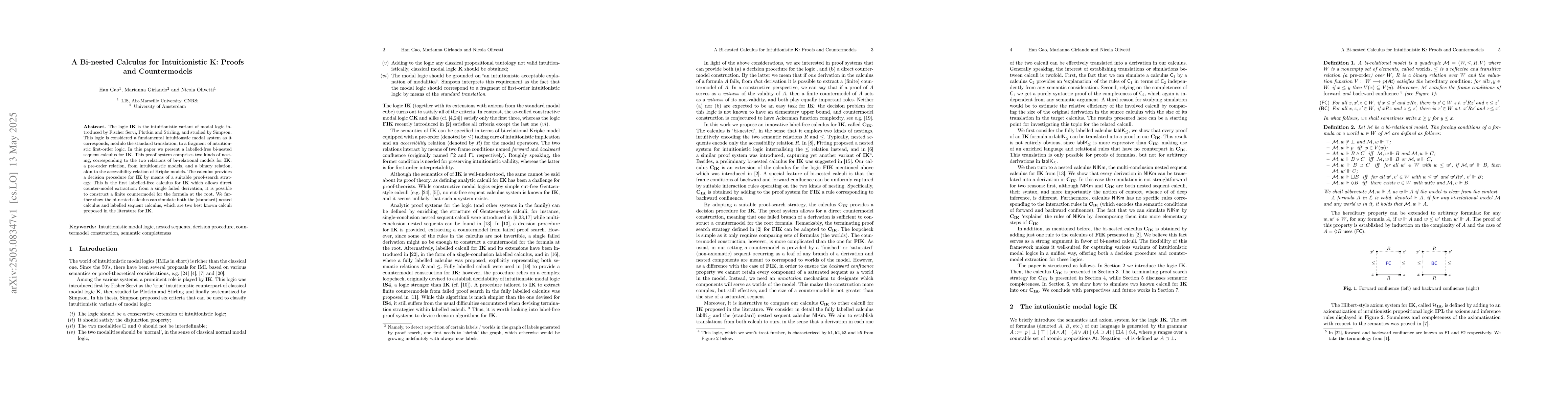 A labelled-free bi-nested sequent calculus for intuitionistic modal logic IK, enabling direct countermodel extraction and decision procedures.