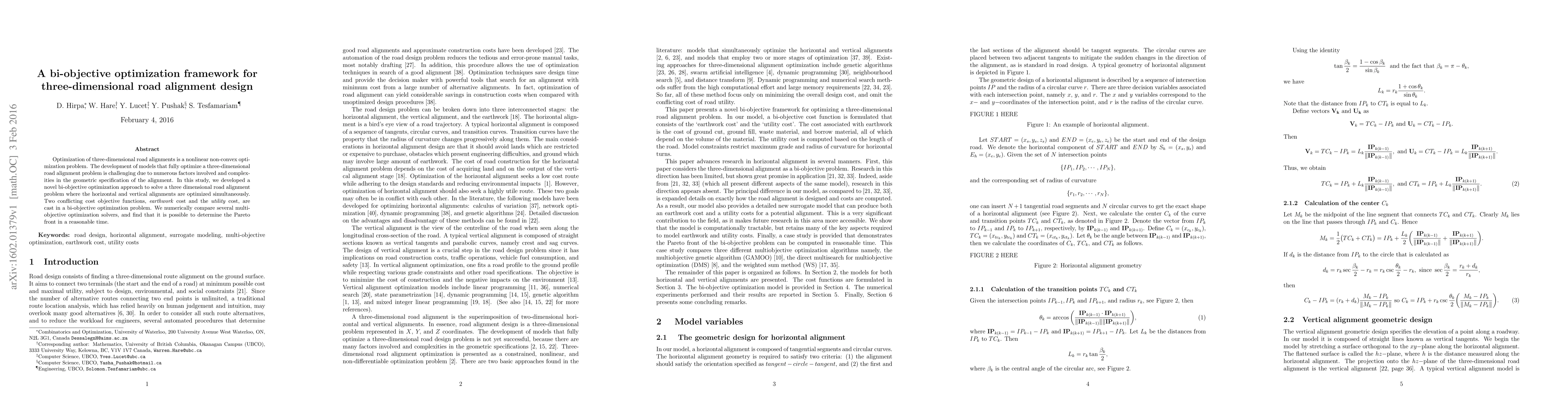 This paper presents a bi-objective optimization framework for designing three-dimensional road alignments, optimizing both horizontal and vertical alignments simultaneously. The approach addresses conflicting cost objectives of earthwork and utility costs, and demonstrates the effectiveness of various multi-objective solvers in finding the Pareto front within a reasonable timeframe.