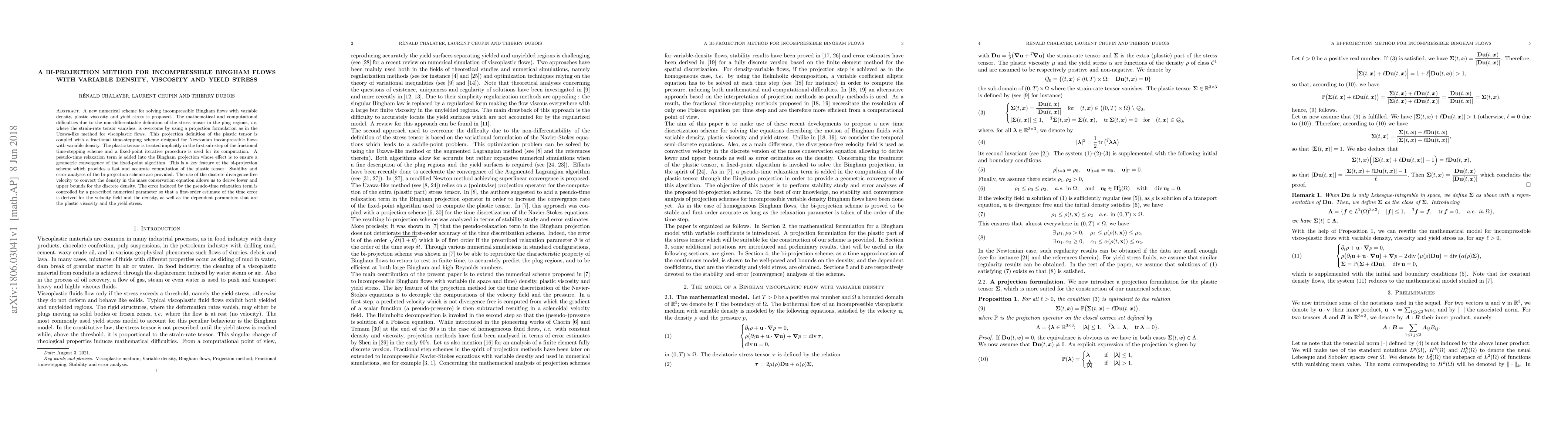 This paper proposes a bi-projection method for solving incompressible Bingham flows with variable density, viscosity, and yield stress. The method uses a projection formulation coupled with a fractional time-stepping scheme to handle the non-differentiable stress tensor, ensuring geometric convergence and accurate computation of the plastic tensor. Stability and error analyses are provided, and the method is shown to derive bounds for density and control time error.