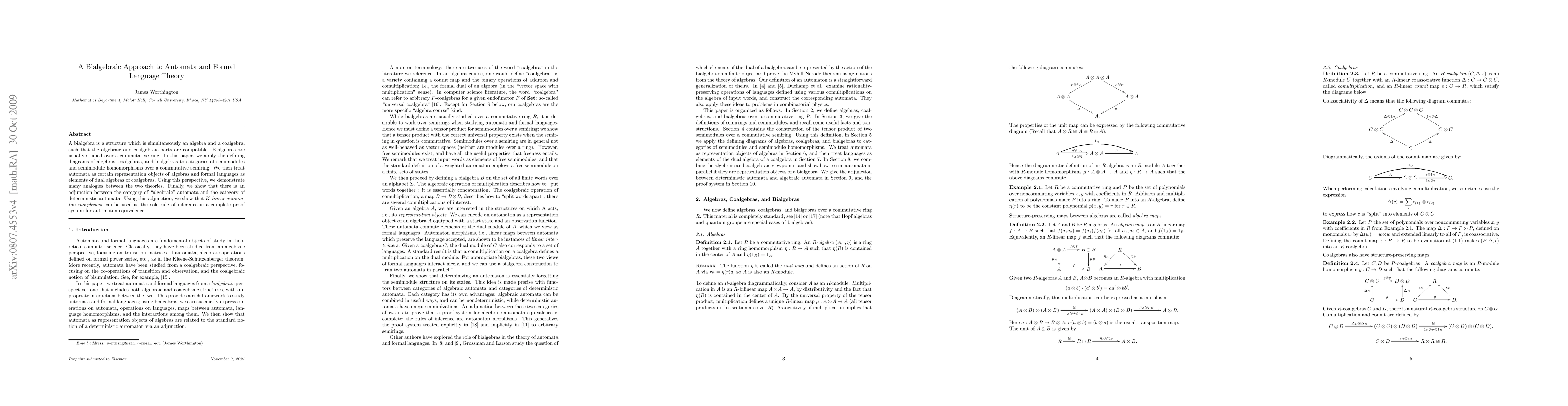 A bialgebra is a structure which is simultaneously an algebra and a coalgebra, such that the algebraic and coalgebraic parts are "compatible". Bialgebras are normally studied over a field or commutative ring. In this paper, we show how to apply the defining diagrams of algebras, coalgebras, and bialgebras to categories of semimodules and semimodule homomorphisms over a commutative semiring. We then show that formal language theory and the theory of bialgebras have essentially undergone "convergent evolution", with the same constructions appearing in both contexts. For example, formal languages correspond to elements of dual algebras of coalgebras, automata are "pointed representation objects" of algebras, automaton morphisms are instances of linear intertwiners, and a construction from the theory of bialgebras shows how to run two automata in parallel. We also show how to associate an automaton with an arbitrary algebra, which in the classical case yields the automaton whose states are formal languages and whose transitions are given by language differentiation.