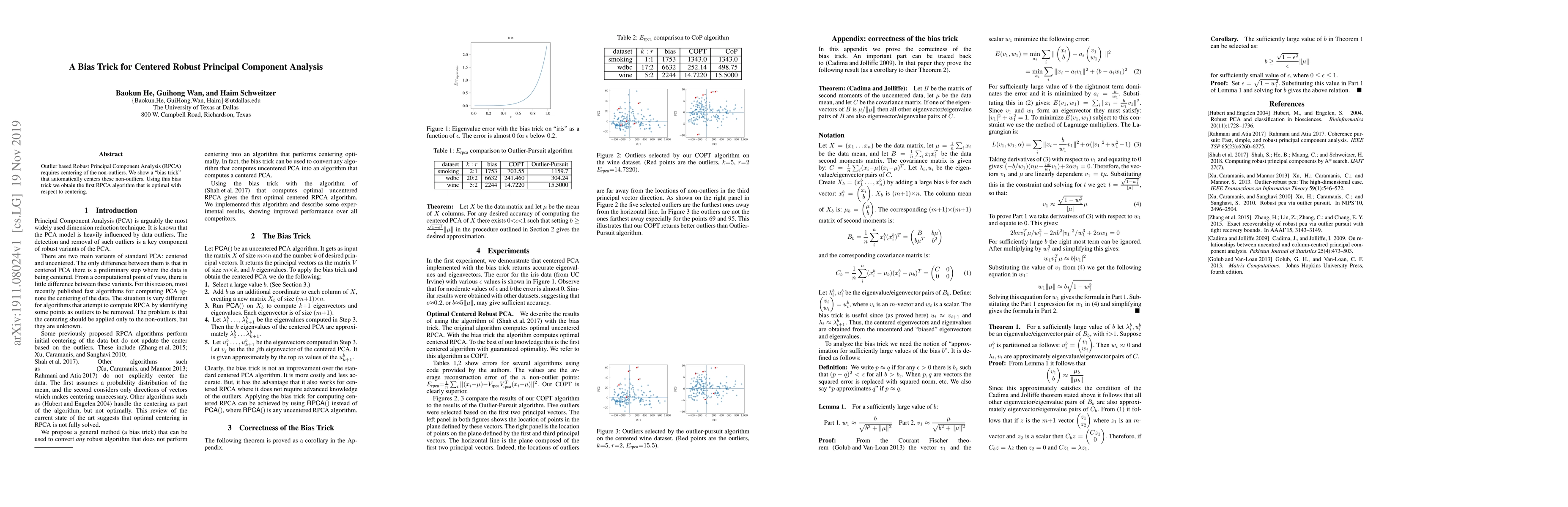 This paper proposes a "bias trick" to automatically center non-outliers in Robust Principal Component Analysis (RPCA), thereby achieving optimal centering without manual intervention. The method results in the first RPCA algorithm that is optimal with respect to centering outliers.
