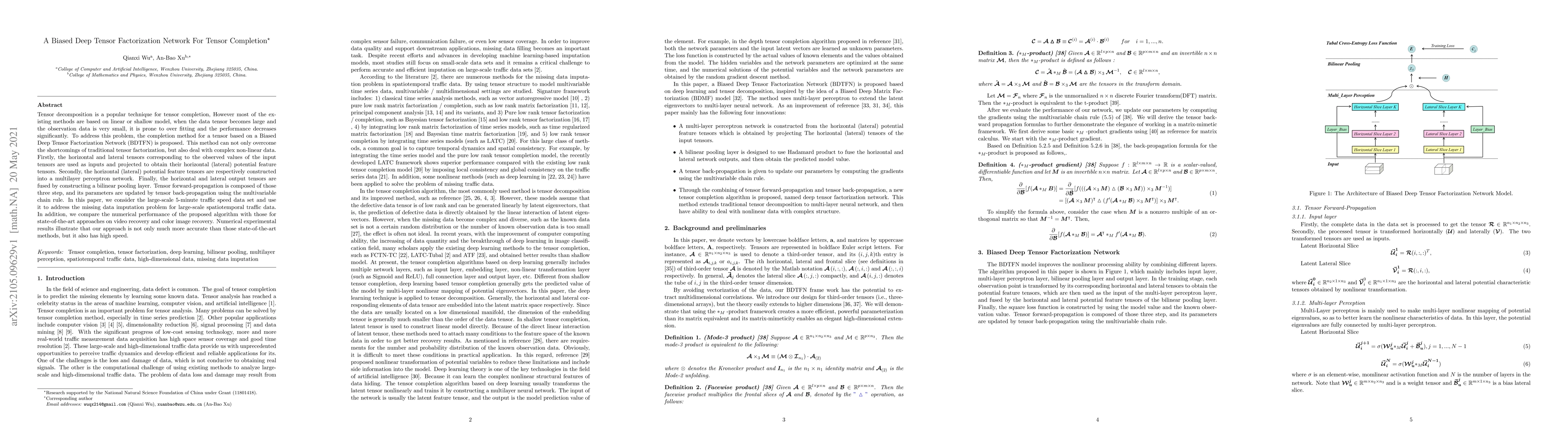 This paper proposes a Biased Deep Tensor Factorization Network (BDTFN) for tensor completion, addressing the limitations of traditional linear methods in large-scale data scenarios. The BDTFN uses deep tensor factorization to handle complex non-linear data, achieving higher accuracy and speed compared to state-of-the-art methods in tensor completion, video recovery, and color image recovery.