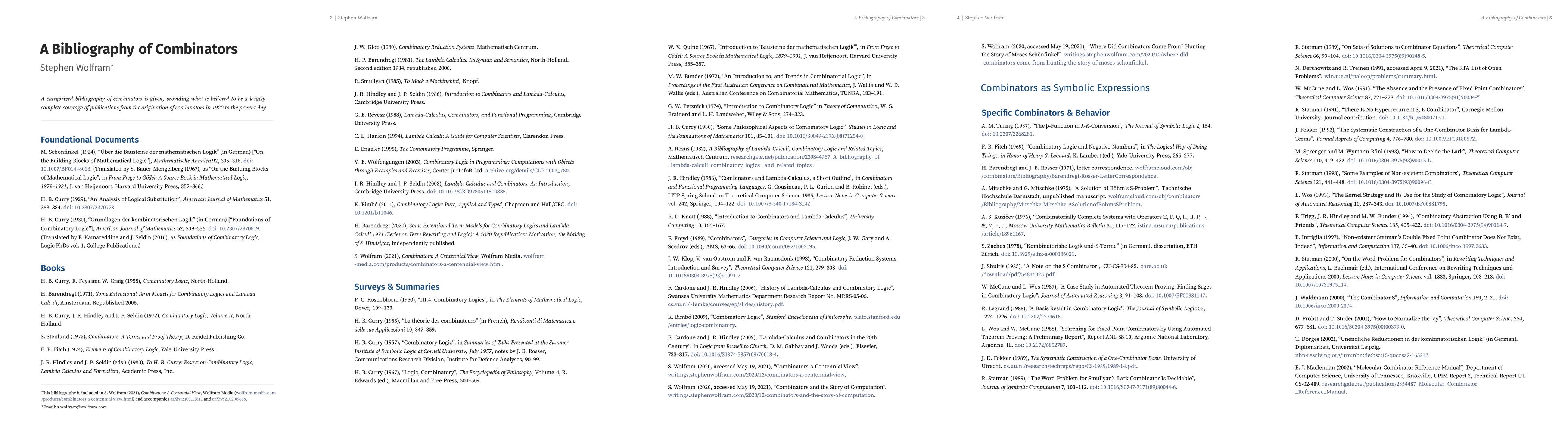 A categorized bibliography of combinators is given, providing what is believed to be a largely complete coverage of publications from the origination of combinators in 1920 to the present day.