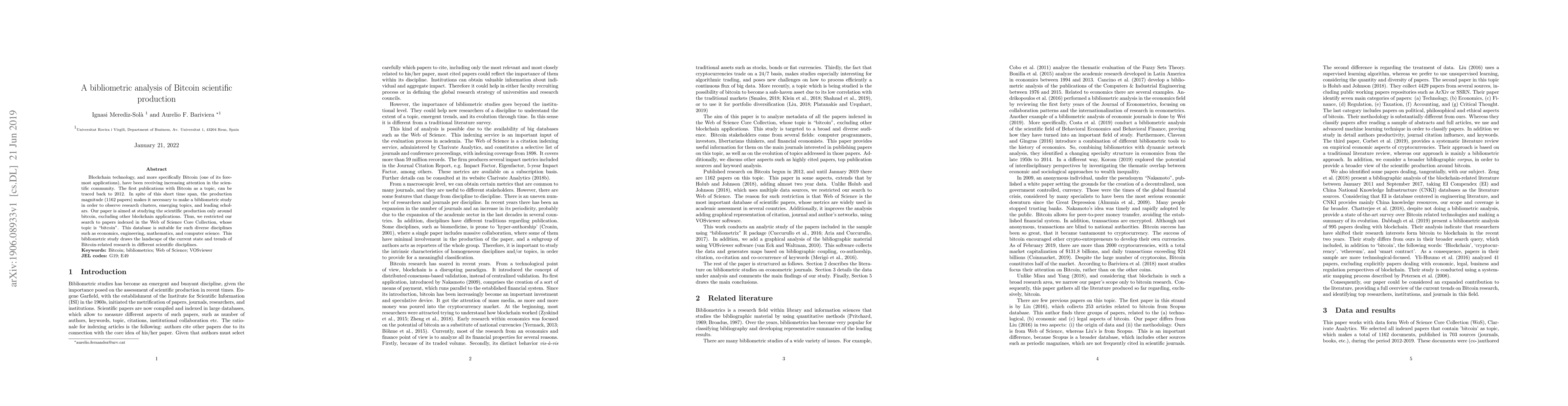 Blockchain technology, and more specifically Bitcoin (one of its foremost applications), have been receiving increasing attention in the scientific community. The first publications with Bitcoin as a topic, can be traced back to 2012. In spite of this short time span, the production magnitude (1162 papers) makes it necessary to make a bibliometric study in order to observe research clusters, emerging topics, and leading scholars. Our paper is aimed at studying the scientific production only around bitcoin, excluding other blockchain applications. Thus, we restricted our search to papers indexed in the Web of Science Core Collection, whose topic is "bitcoin". This database is suitable for such diverse disciplines such as economics, engineering, mathematics, and computer science. This bibliometric study draws the landscape of the current state and trends of Bitcoin-related research in different scientific disciplines.