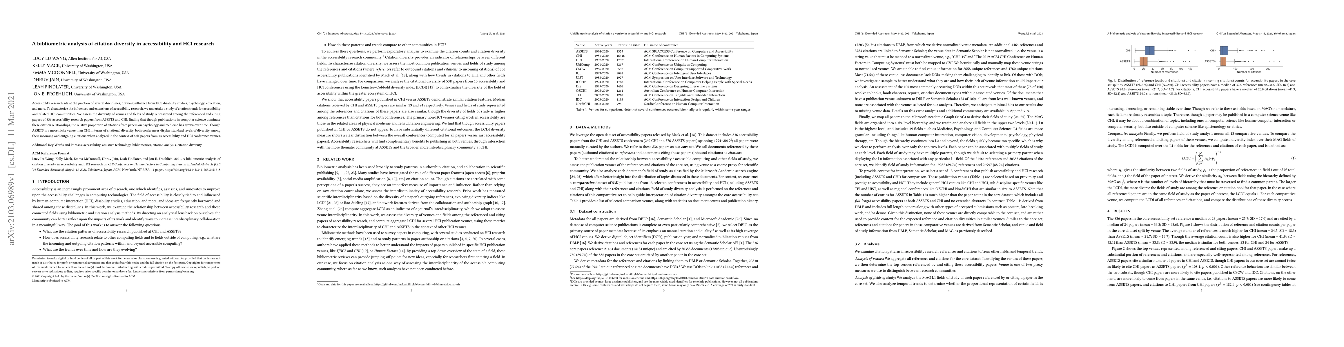 This study analyzes citation trends in accessibility and HCI research, revealing that while computer science dominates, citations from psychology and medicine have increased over time. Both ASSETS and CHI conferences exhibit standard citation diversity relative to other accessibility and HCI venues.