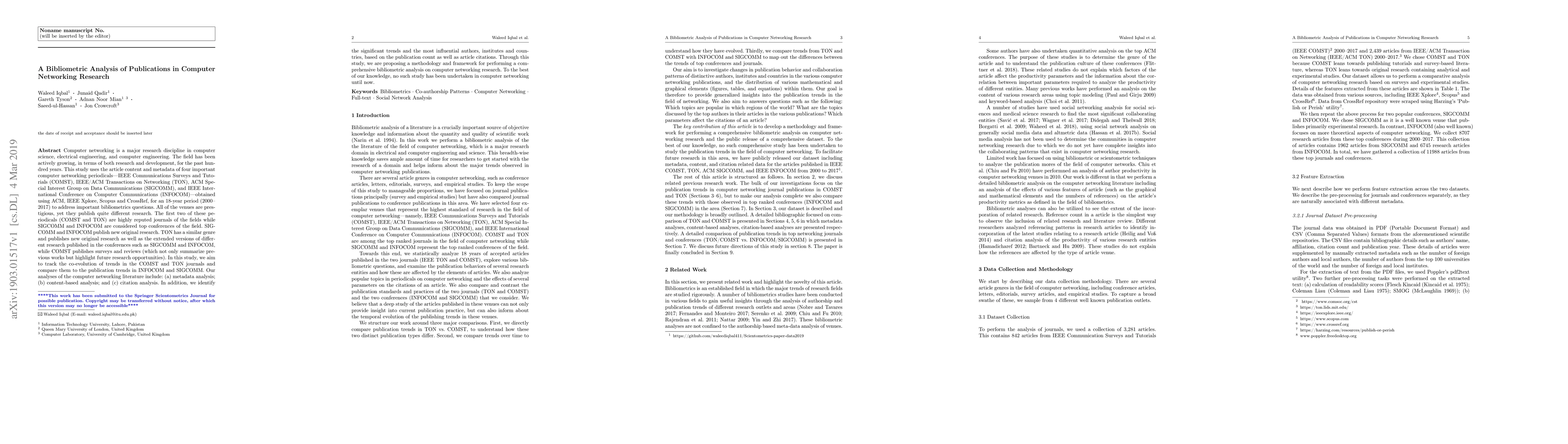 This study conducts a comprehensive bibliometric analysis of four major computer networking publications from 2000-2017, examining trends, influential authors, and citation patterns to propose a new methodology for analyzing computer networking research. The analysis includes metadata, content, and citation metrics to compare journals and conferences.