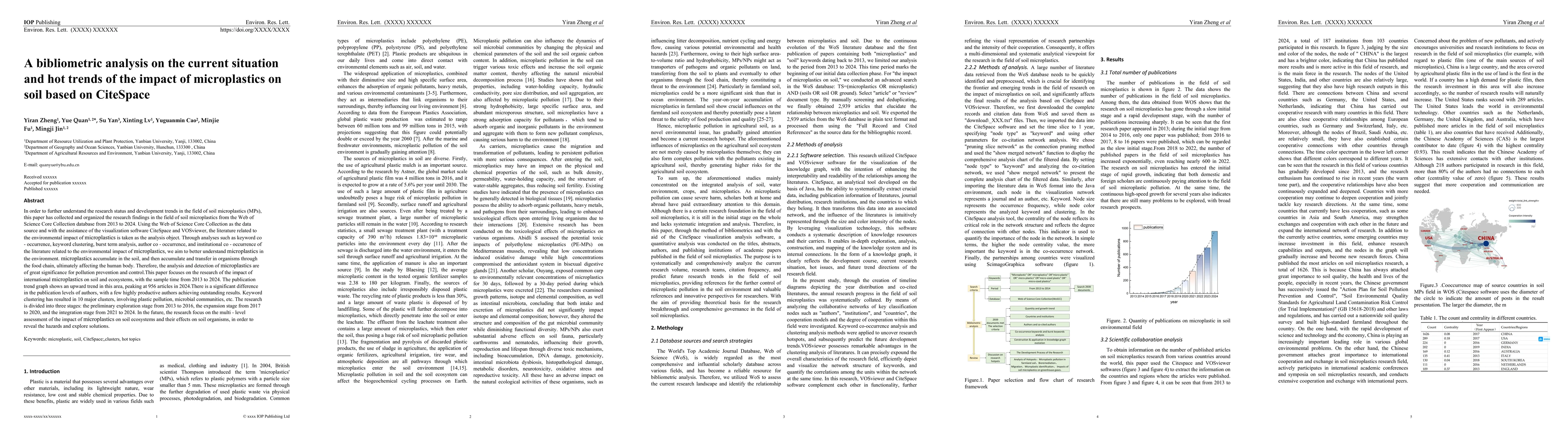 This paper aims to comprehensively grasp the research status and development trends of soil microplastics (MPs). It collects studies from the Web of Science Core Collection covering the period from 2013 to 2024. Employing CiteSpace and VOSviewer, the paper conducts in - depth analyses of literature regarding the environmental impacts of microplastics. These analyses involve keyword co - occurrence, clustering, burst term identification, as well as co - occurrence analysis of authors and institutions. Microplastics can accumulate in soil, transfer through food chains, and ultimately affect human health, making the research on them essential for effective pollution control. Focusing on the international research on the impacts of microplastics on soil and ecosystems, the study reveals a steadily increasing trend in the number of publications each year, reaching a peak of 956 articles in 2024. A small number of highly productive authors contribute significantly to the overall research output. The keyword clustering analysis results in ten major clusters, including topics such as plastic pollution and microbial communities. The research on soil microplastics has evolved through three distinct stages: the preliminary exploration phase from 2013 to 2016, the expansion phase from 2017 to 2020, and the integration phase from 2021 to 2024. For future research, multi - level assessments of the impacts of microplastics on soil ecosystems and organisms should be emphasized, in order to fully uncover the associated hazards and develop practical solutions.