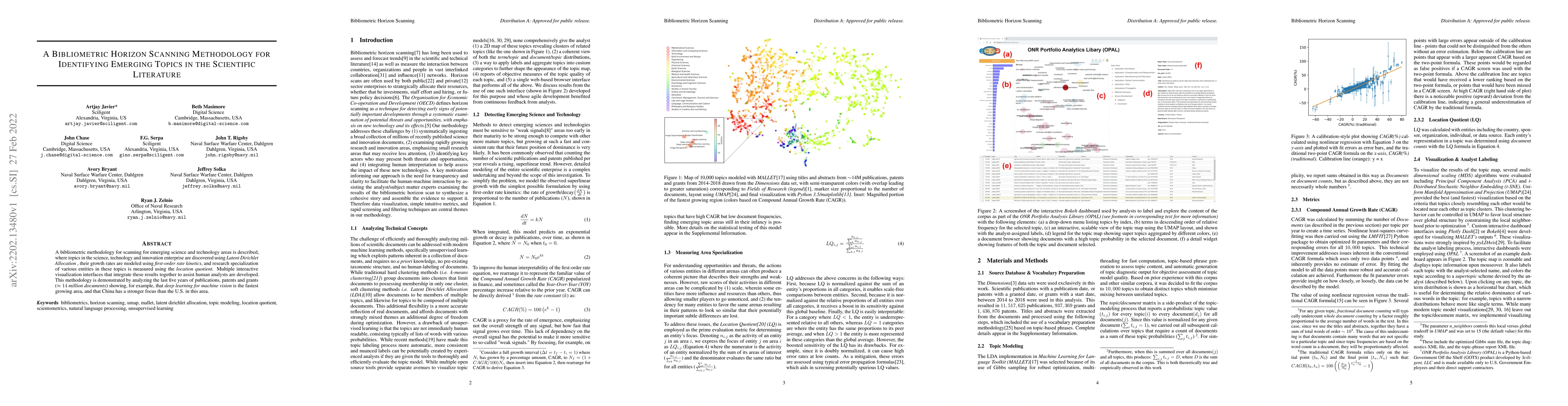 A bibliometric methodology for scanning for emerging science and technology areas is described, where topics in the science, technology and innovation enterprise are discovered using Latent Dirichlet Allocation, their growth rates are modeled using first-order rate kinetics, and research specialization of various entities in these topics is measured using the location quotient. Multiple interactive visualization interfaces that integrate these results together to assist human analysts are developed. This methodology is demonstrated by analyzing the last five years of publications, patents and grants (~ 14 million documents) showing, for example, that deep learning for machine vision is the fastest growing area, and that China has a stronger focus than the U.S. in this area.