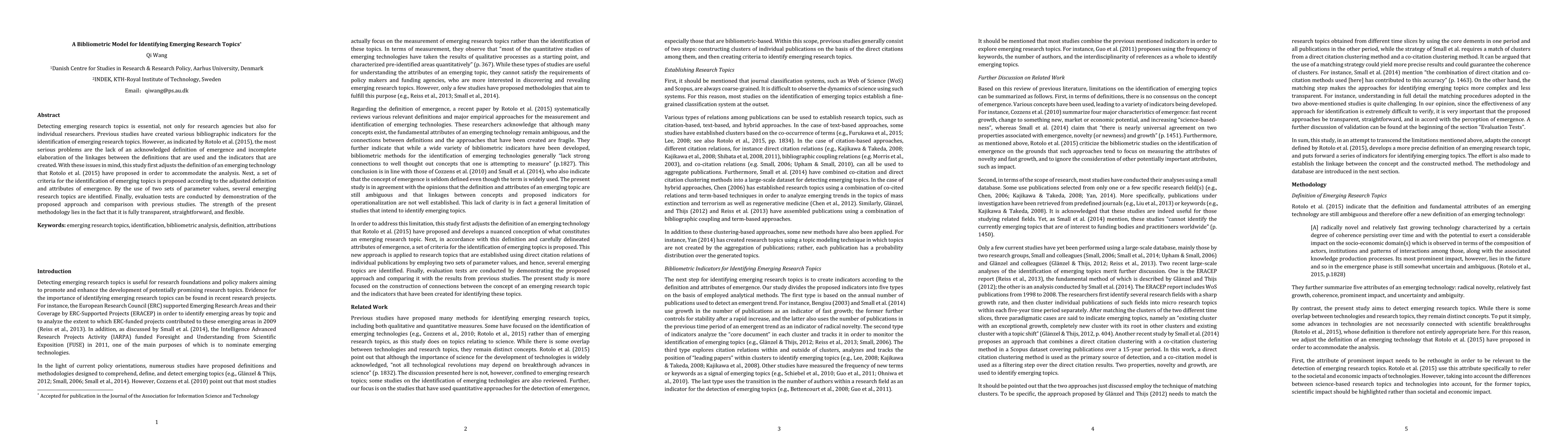 This study develops a bibliometric model to identify emerging research topics, addressing previous methodological limitations and proposing a flexible approach for researchers and agencies. The model uses adjusted criteria and attributes of emergence to detect new research areas.