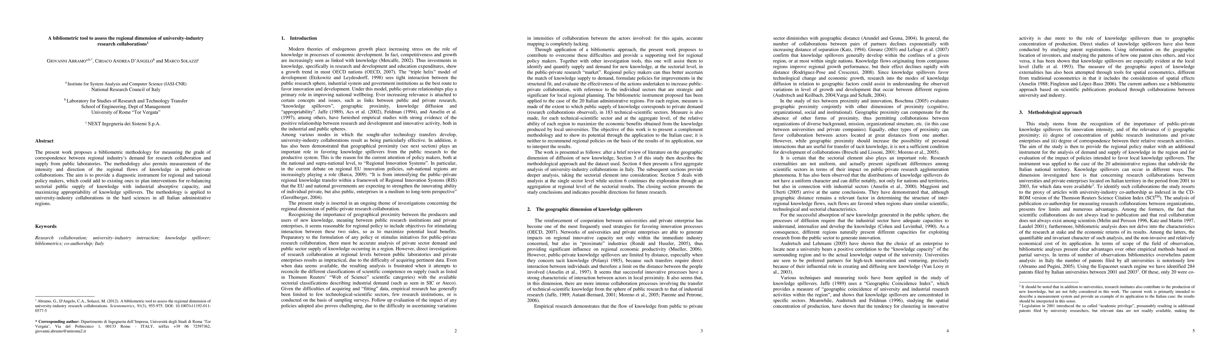 The present work proposes a bibliometric methodology for measuring the grade of correspondence between regional industry's demand for research collaboration and supply from public laboratories. The methodology also permits measurement of the intensity and direction of the regional flows of knowledge in public-private collaborations. The aim is to provide a diagnostic instrument for regional and national policy makers, which could add to existing ones to plan interventions for re-balancing sectorial public supply of knowledge with industrial absorptive capacity, and maximizing appropriability of knowledge spillovers. The methodology is applied to university-industry collaborations in the hard sciences in all Italian administrative regions.