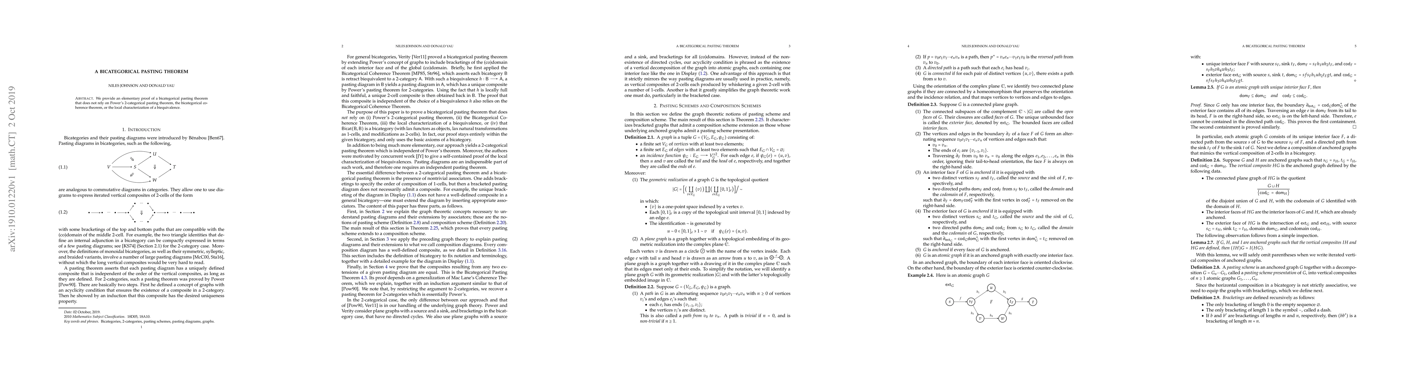Title: A bicategorical pasting theorem Summary: This paper presents a straightforward proof of a bicategorical pasting theorem, independent of Power's 2-categorical pasting theorem, bicategorical coherence, or local biequivalence characterization.