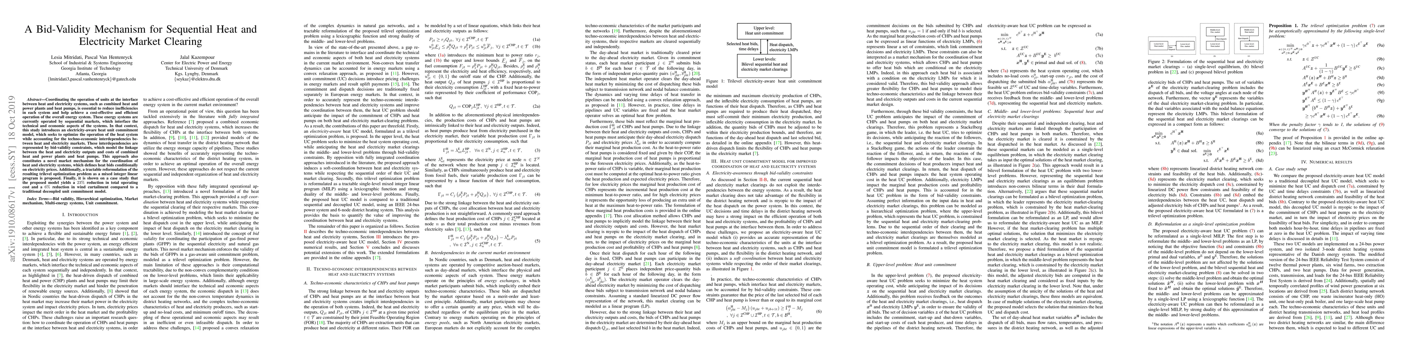 This paper proposes a novel bid-validity mechanism for coordinating heat and electricity markets through an electricity-aware heat unit commitment model, achieving a 23% reduction in operating costs and a 6% reduction in wind curtailment compared to traditional models. The model reformulates the trilevel optimization problem into a mixed integer linear program.