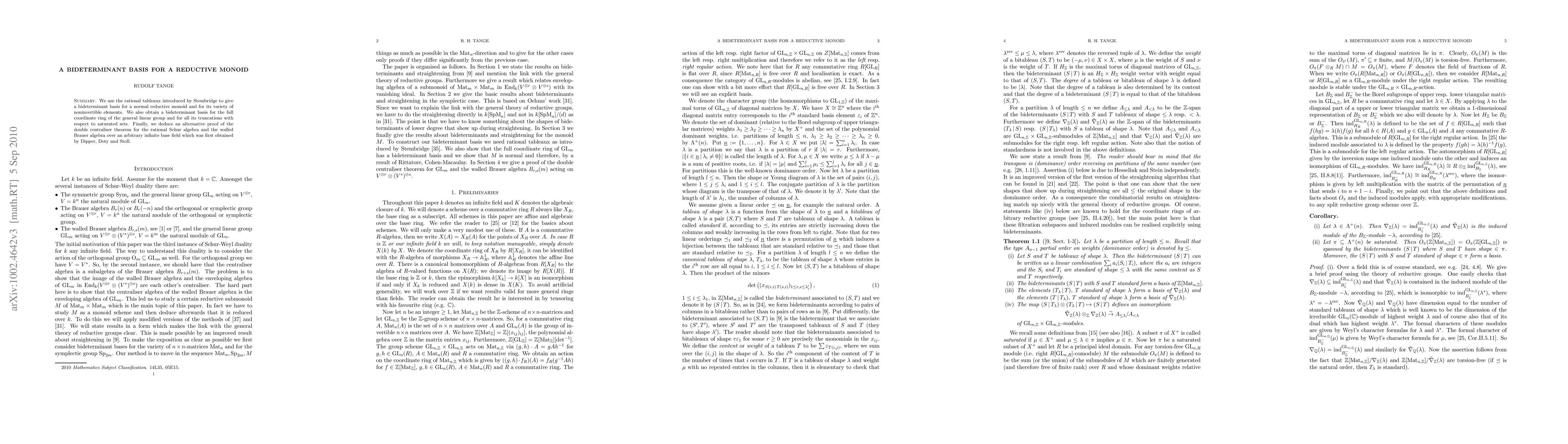 We use the rational tableaux introduced by Stembridge to give a bideterminant basis for a normal reductive monoid and for its variety of noninvertible elements. We also obtain a bideterminant basis for the full coordinate ring of the general linear group and for all its truncations with respect to saturated sets. Finally, we deduce an alternative proof of the double centraliser theorem for the rational Schur algebra and the walled Brauer algebra over an arbitrary infinite base field which was first obtained by Dipper, Doty and Stoll.