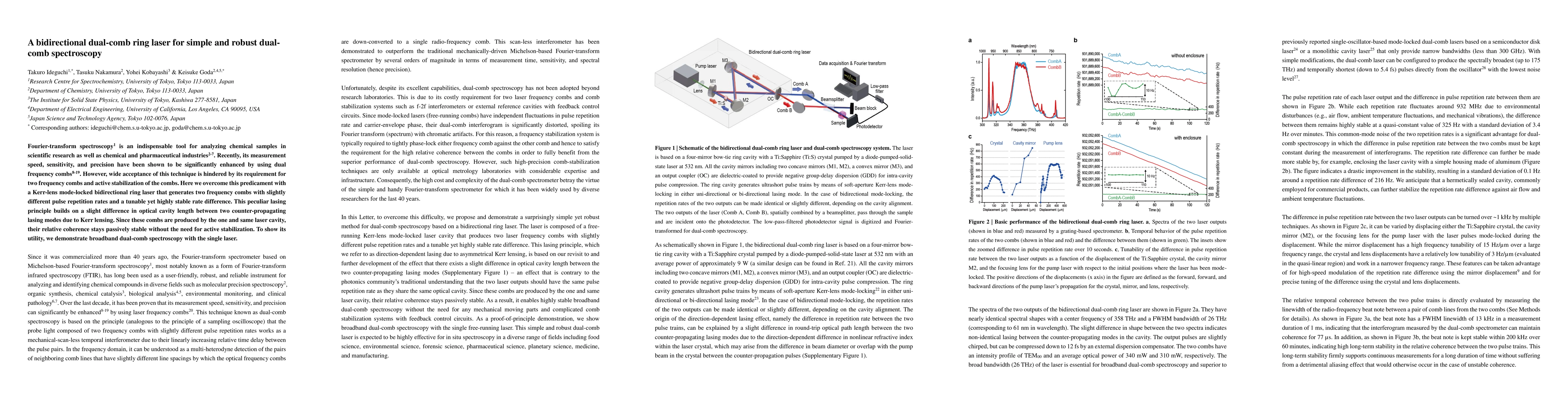 This paper introduces a bidirectional dual-comb ring laser that generates two frequency combs within a single laser cavity, enhancing measurement speed and precision for Fourier-transform spectroscopy without the need for active stabilization, thus simplifying dual-comb spectroscopy.