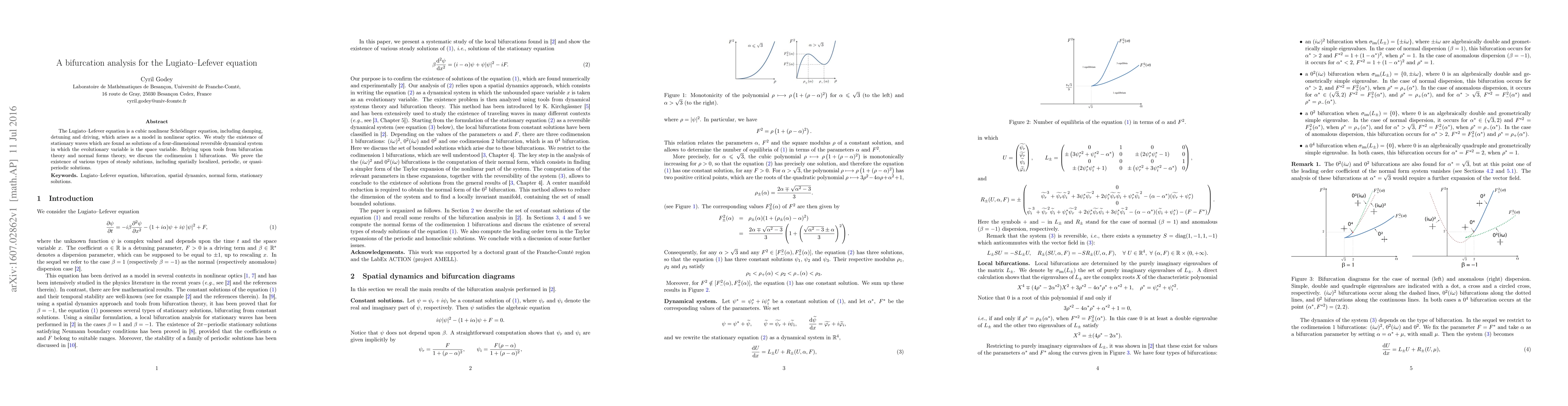 This paper conducts a bifurcation analysis of the Lugiato-Lefever equation, a model in nonlinear optics, to explore the existence of stationary waves through codimension 1 bifurcations. The study reveals various types of steady solutions, including localized, periodic, and quasi-periodic patterns.