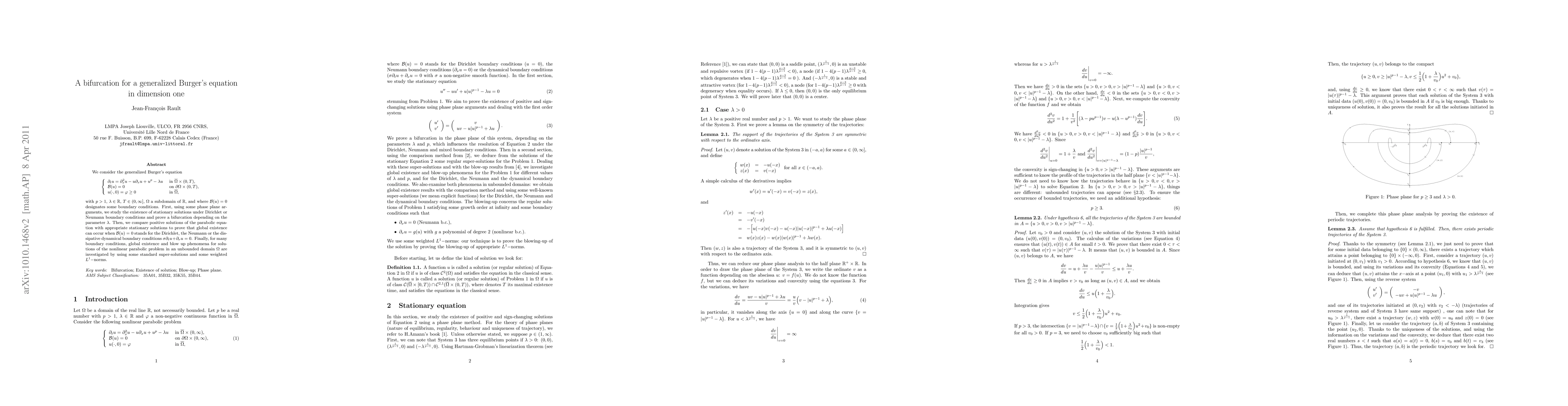 We consider a generalized Burger's equation (dtu = dxxu - udxu + up - {\lambda}u)in a subdomain of R, under various boundary conditions. First, using some phase plane arguments, we study the existence of stationary solutions under Dirichlet or Neumann boundary conditions and prove a bifurcation depending on the parameters. Then, we compare positive solutions of the parabolic equation with appropriate stationary solutions to prove that global existence can occur for the Dirichlet, the Neumann or the dissipative dynamical boundary conditions {\sigma}dtu+d{\nu}u = 0. Finally, for many boundary conditions, global existence and blow up phenomena for solutions of the nonlinear parabolic problem in an unbounded domain are investigated by using some standard super-solutions and some weighted L1-norms.