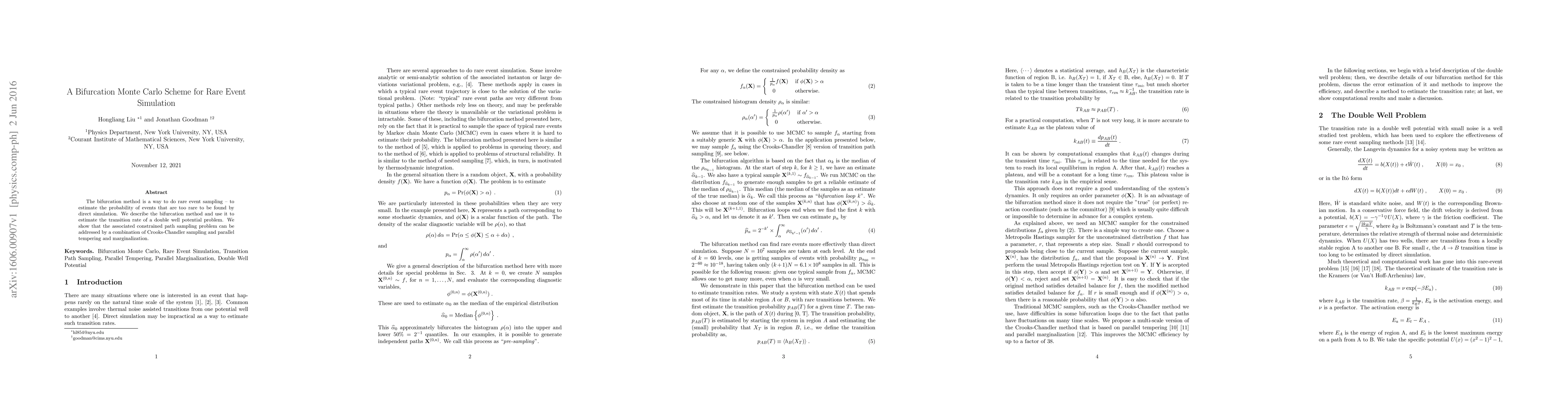 The bifurcation method is presented for rare event simulation, demonstrating its application in estimating the transition rate of a double well potential problem. The method combines Crooks-Chandler sampling, parallel tempering, and marginalization for effective constrained path sampling.