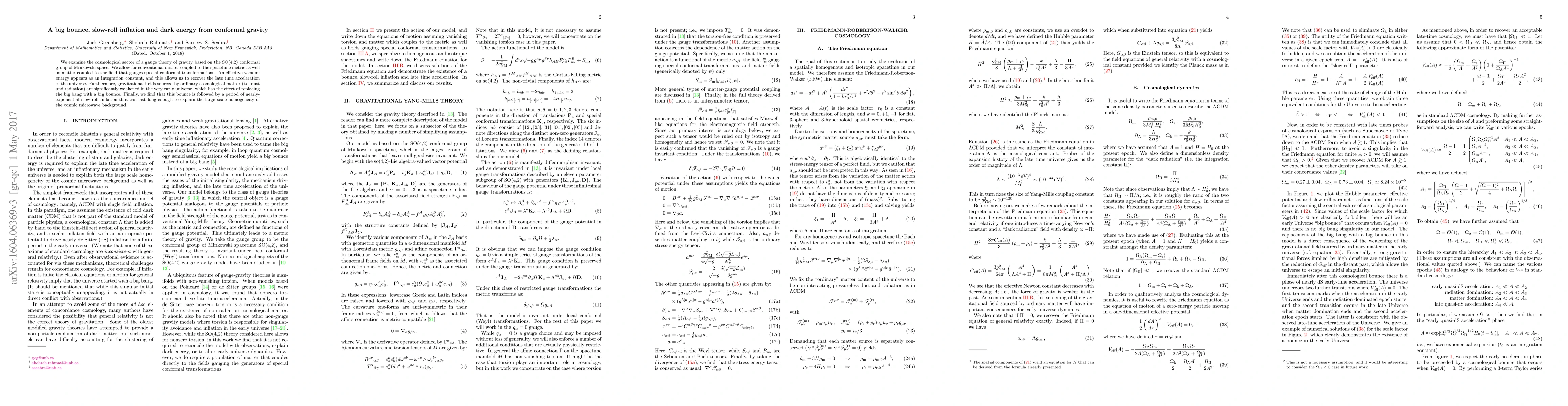 We examine the cosmological sector of a gauge theory of gravity based on the SO(4,2) conformal group of Minkowski space. We allow for conventional matter coupled to the spacetime metric as well as matter coupled to the field that gauges special conformal transformations. An effective cosmological constant is generated dynamically via solution of the equations of motion, and this allows us to recover the late time acceleration of the universe. Furthermore, gravitational fields sourced by ordinary cosmological matter (i.e. dust and radiation) are significantly weakened in the very early universe, which has the effect of replacing the big bang with a big bounce. Finally, we find that this bounce is followed by a period of nearly-exponential slow roll inflation that can last long enough to explain the large scale homogeneity of the cosmic microwave background.