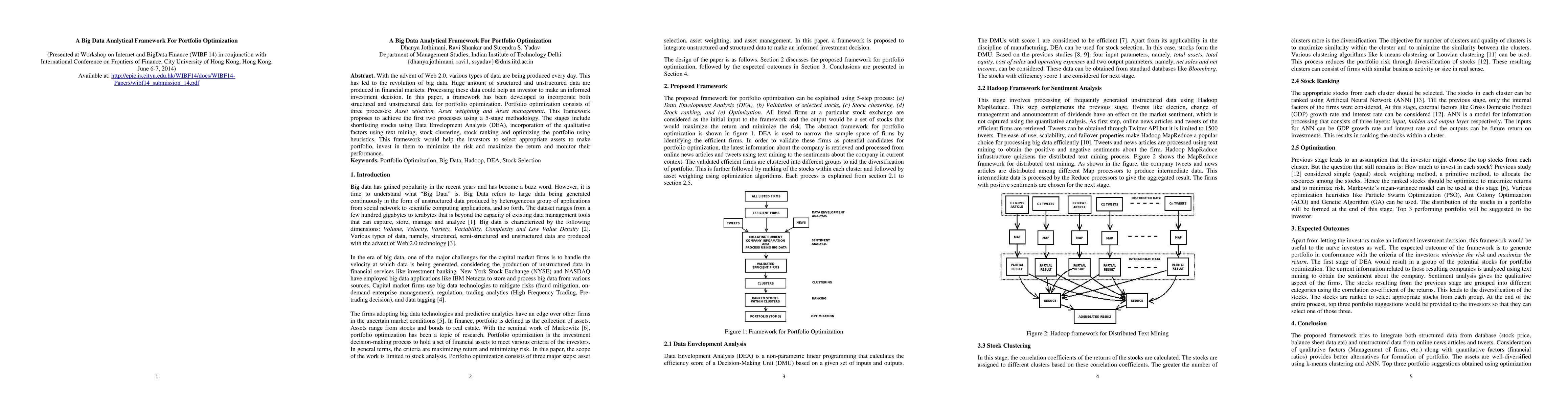 With the advent of Web 2.0, various types of data are being produced every day. This has led to the revolution of big data. Huge amount of structured and unstructured data are produced in financial markets. Processing these data could help an investor to make an informed investment decision. In this paper, a framework has been developed to incorporate both structured and unstructured data for portfolio optimization. Portfolio optimization consists of three processes: Asset selection, Asset weighting and Asset management. This framework proposes to achieve the first two processes using a 5-stage methodology. The stages include shortlisting stocks using Data Envelopment Analysis (DEA), incorporation of the qualitative factors using text mining, stock clustering, stock ranking and optimizing the portfolio using heuristics. This framework would help the investors to select appropriate assets to make portfolio, invest in them to minimize the risk and maximize the return and monitor their performance.