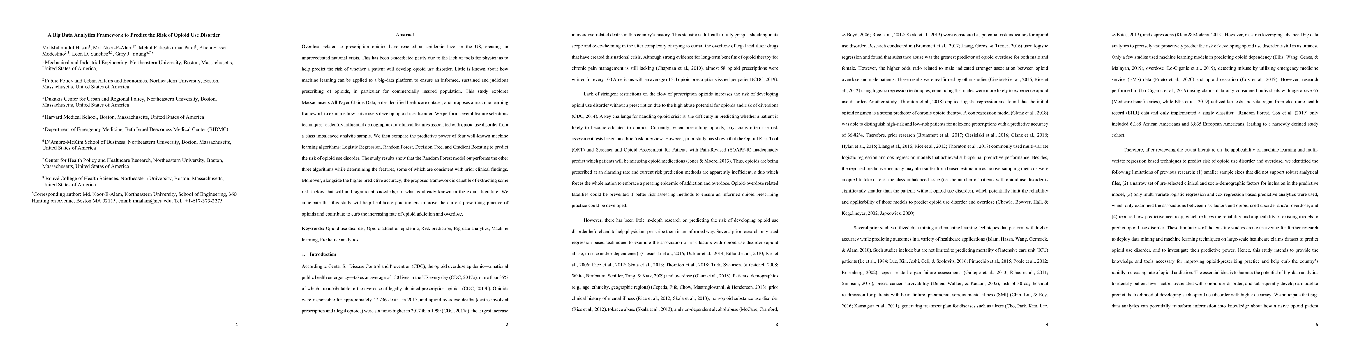 This study develops a machine learning framework using Massachusetts All Payer Claims Data to predict opioid use disorder risk, finding that Random Forest outperforms other algorithms like Logistic Regression, Decision Tree, and Gradient Boosting. The framework identifies influential demographic and clinical features, contributing new insights to curb opioid addiction.