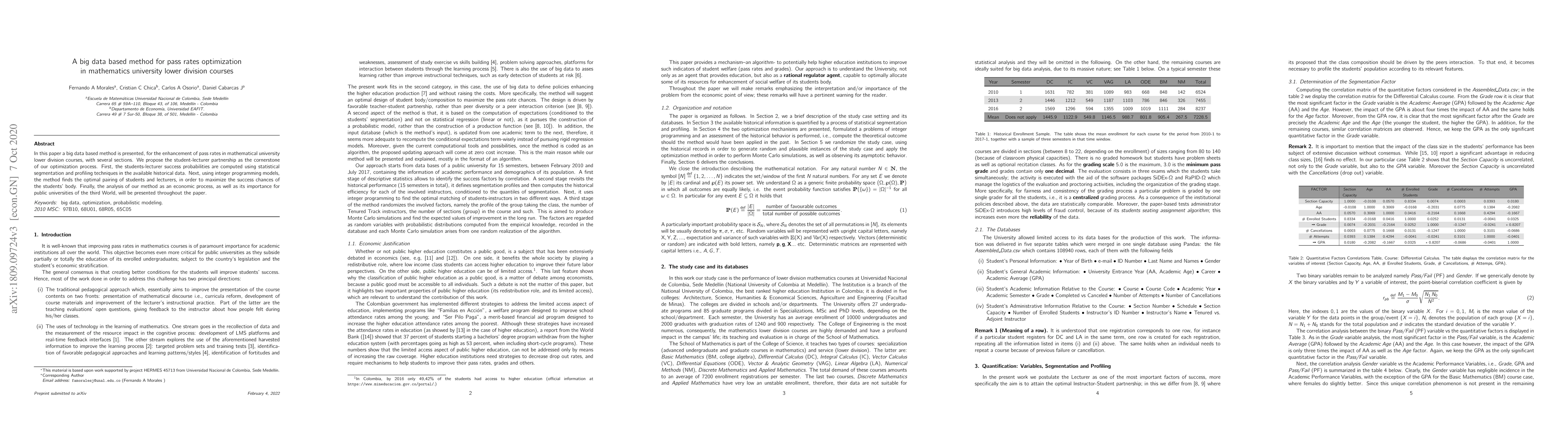 In this paper an algorithm designed for large databases is introduced for the enhancement of pass rates in mathematical university lower division courses with several sections. Using integer programming techniques, the algorithm finds the optimal pairing of students and lecturers in order to maximize the success chances of the students' body. The students-lecturer success probability is computed according to their corresponding profiles stored in the data bases.