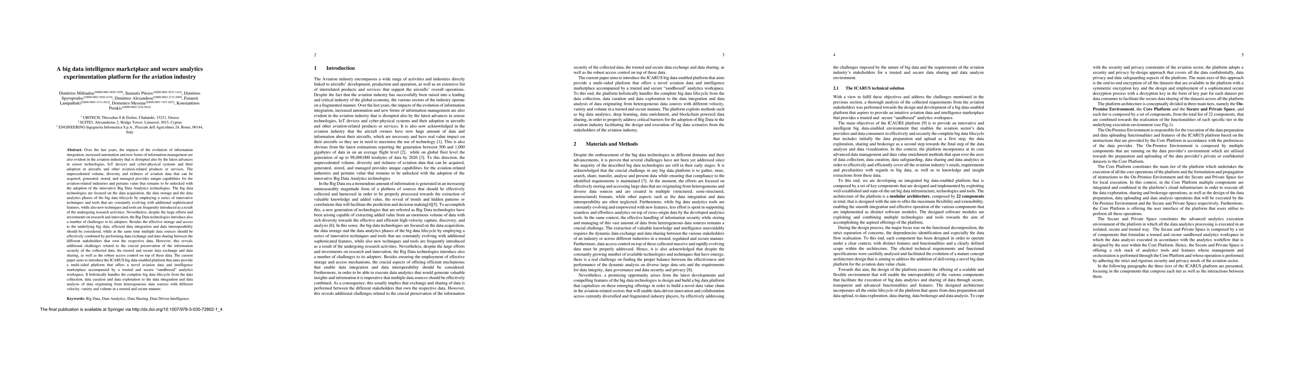 The paper presents the ICARUS platform, a big data-enabled marketplace and secure analytics experimentation environment for the aviation industry, addressing challenges in data integration, interoperability, and security while facilitating data collection, curation, and analysis. It aims to unlock the value of aviation data through innovative analytics technologies.