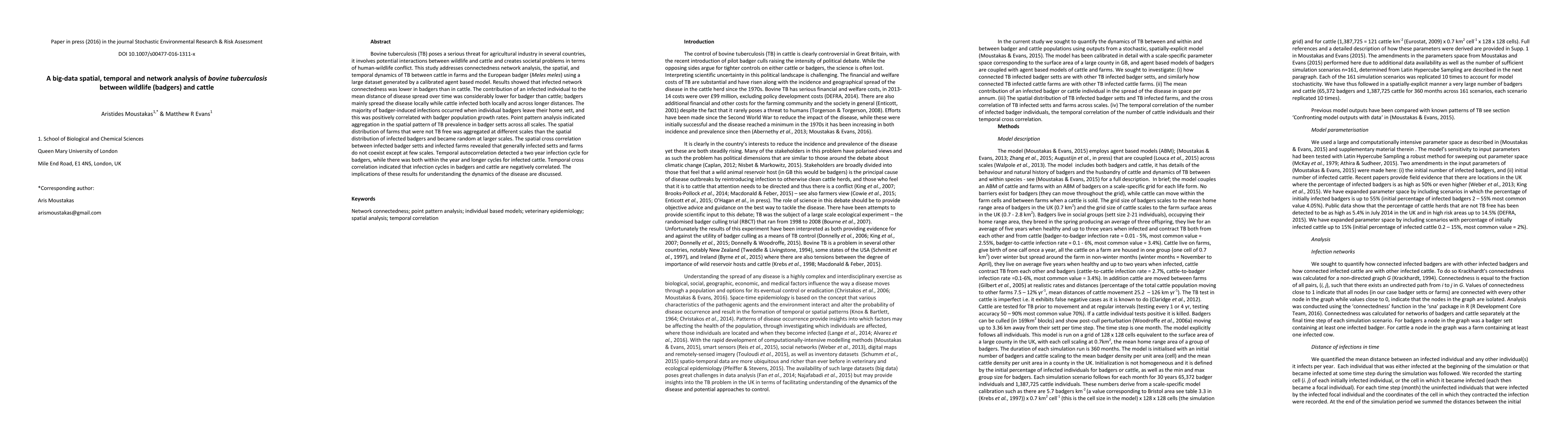 This study employs a large-scale data analysis to investigate the spatial, temporal, and network dynamics of bovine tuberculosis between badgers and cattle. Findings suggest that badgers spread the disease locally, while cattle facilitate both local and long-distance transmission, indicating different roles in the disease's spread and implications for control strategies.