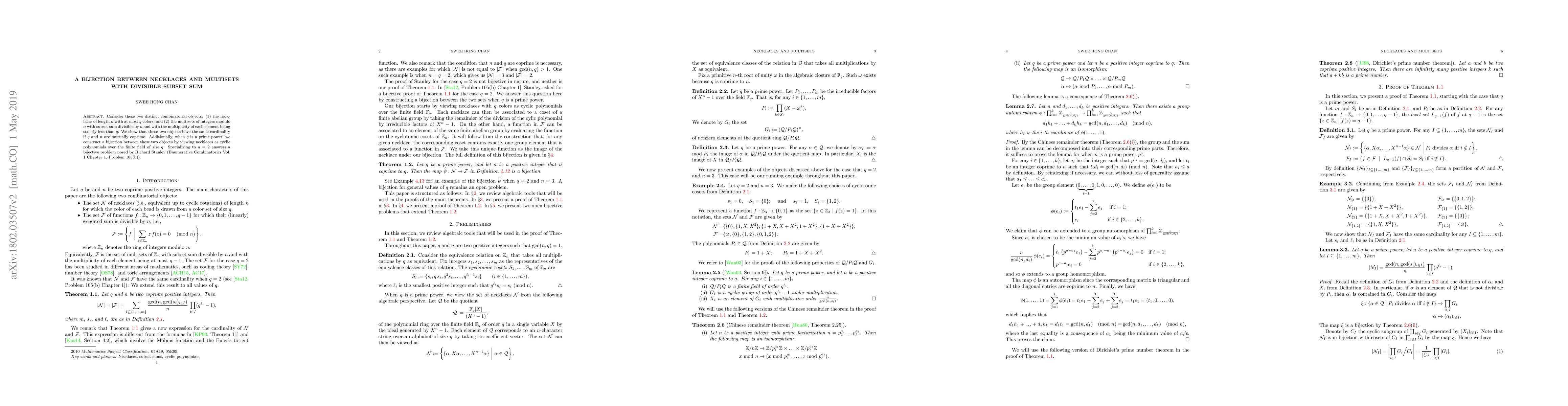 Consider these two distinct combinatorial objects: (1) the necklaces of length $n$ with at most $q$ colors, and (2) the multisets of integers modulo $n$ with subset sum divisible by $n$ and with the multiplicity of each element being strictly less than $q$. We show that these two objects have the same cardinality when $q$ and $n$ are mutually coprime. Additionally, when $q$ is a prime power, we construct a bijection between these two objects by viewing necklaces as cyclic polynomials over the finite field of size $q$. Specializing to $q=2$ answers a bijective problem posed by Richard Stanley.