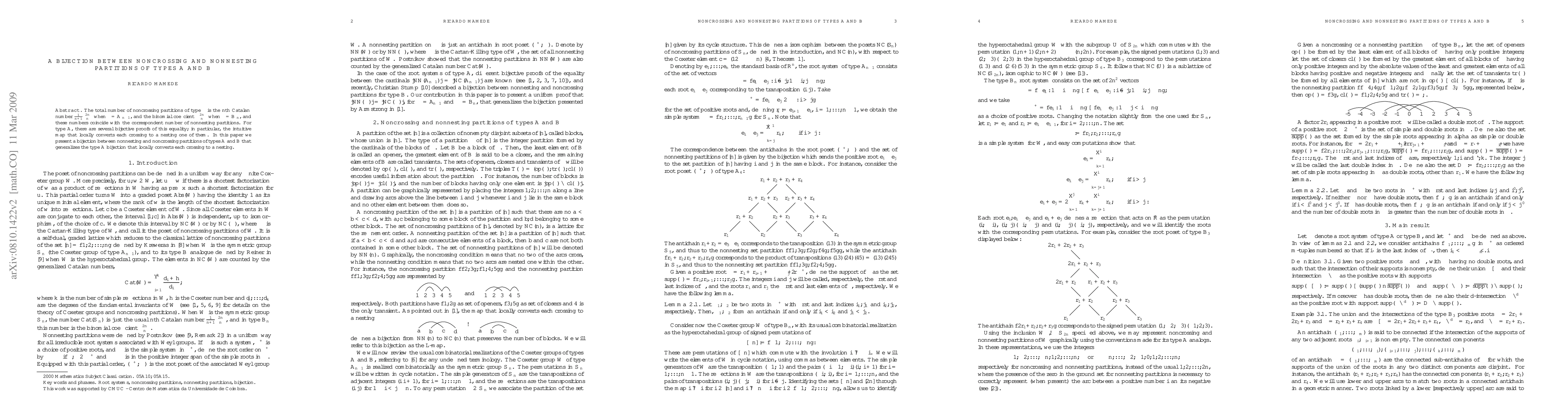 This paper establishes a bijection between noncrossing and nonnesting partitions for types A and B, generalizing the known type A bijection that converts crossings to nestings. The bijection extends the equivalence between the Catalan numbers for noncrossing partitions of type A and binomial coefficients for type B to nonnesting partitions.
