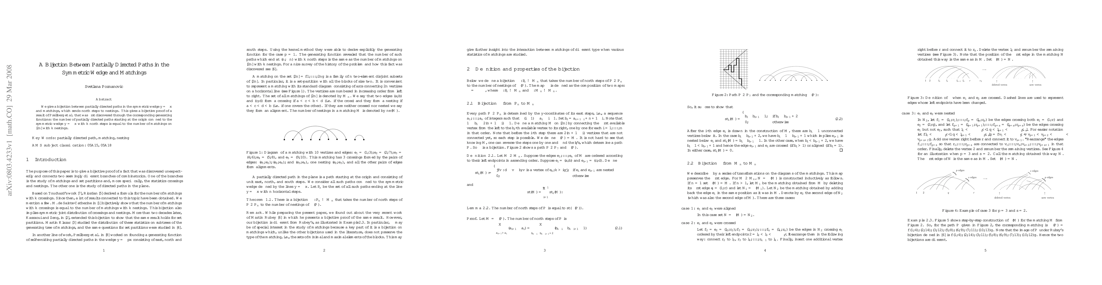 Summary: This paper establishes a bijection between partially directed paths in the symmetric wedge y= +/-x and matchings, proving a result by Prellberg et al. that connects the number of such paths with k north steps to the number of matchings on [2n] with k nestings.