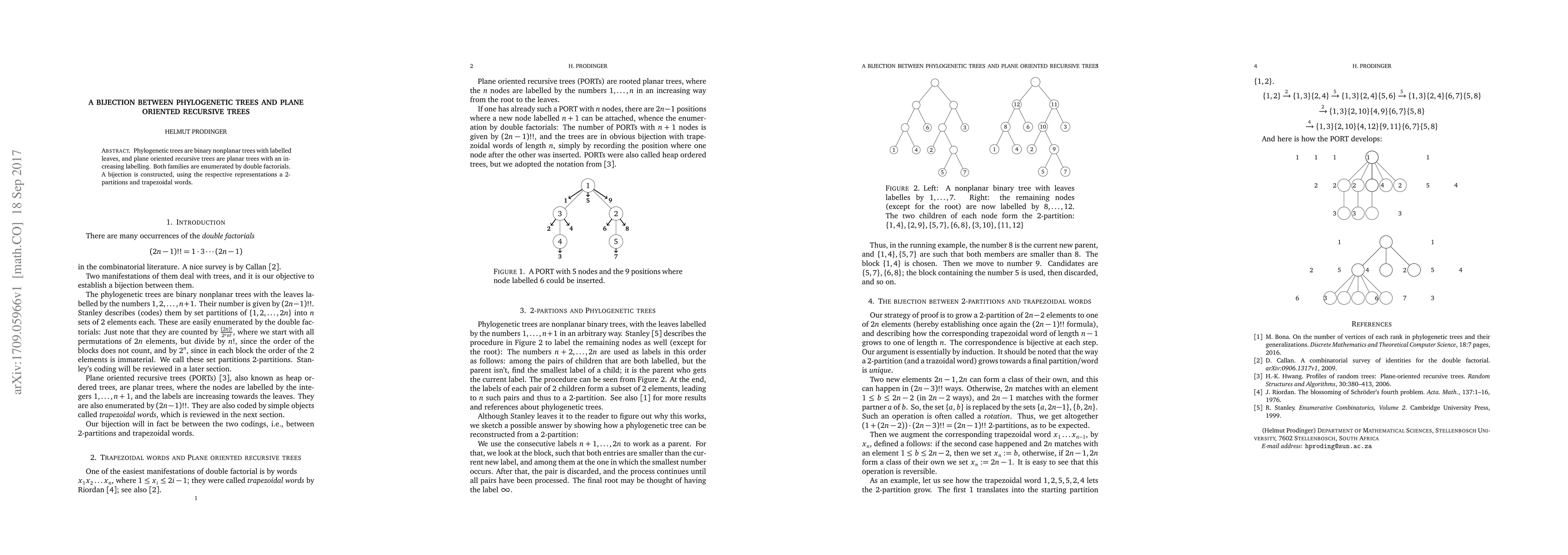 Summary: This paper establishes a bijection between phylogenetic trees and plane oriented recursive trees, showing that both types of trees are enumerated by double factorials through their representations as 2-partitions and trapezoidal words.
