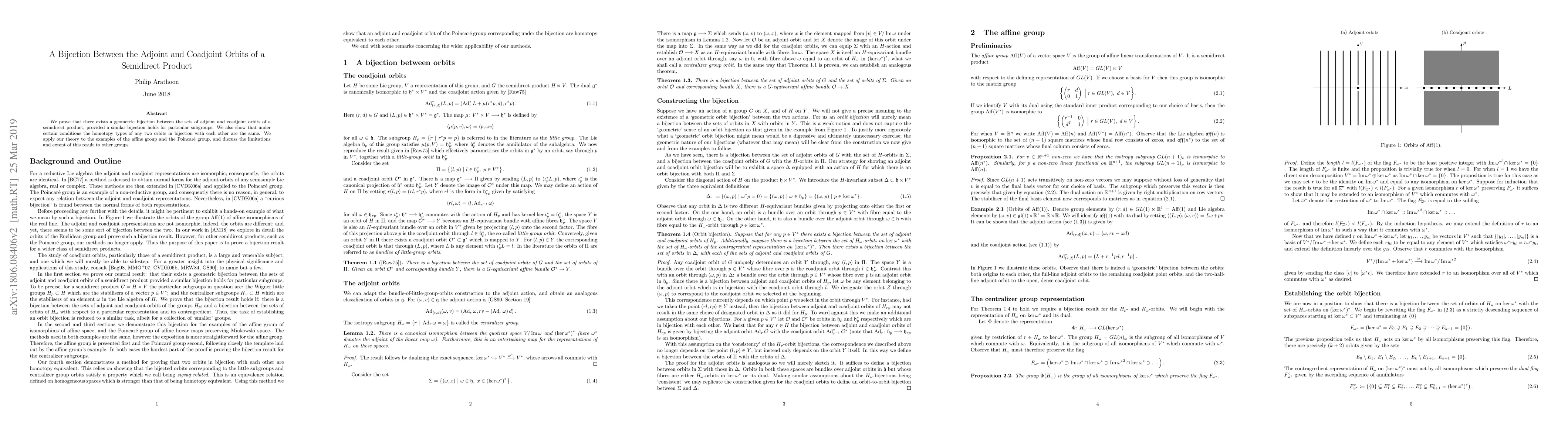This paper establishes a geometric bijection between adjoint and coadjoint orbits of a semidirect product, provided a similar bijection exists for specific subgroups. It also demonstrates that orbits in bijection share the same homotopy type under certain conditions, and applies this theory to the affine and Poincaré groups.