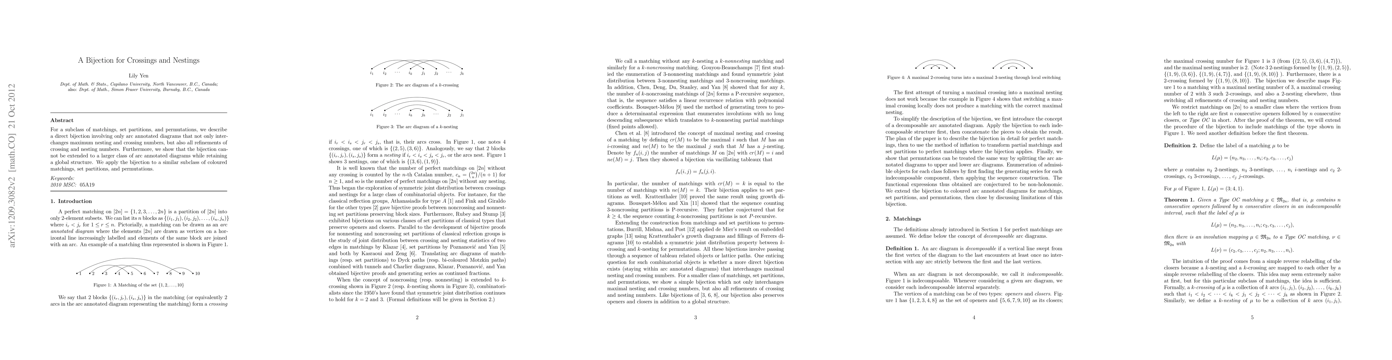 Researchers developed a bijection that swaps maximum nesting and crossing numbers for certain matchings, set partitions, and permutations, while also considering all refinements of these numbers. The discovery highlights the complexity of these combinatorial concepts.