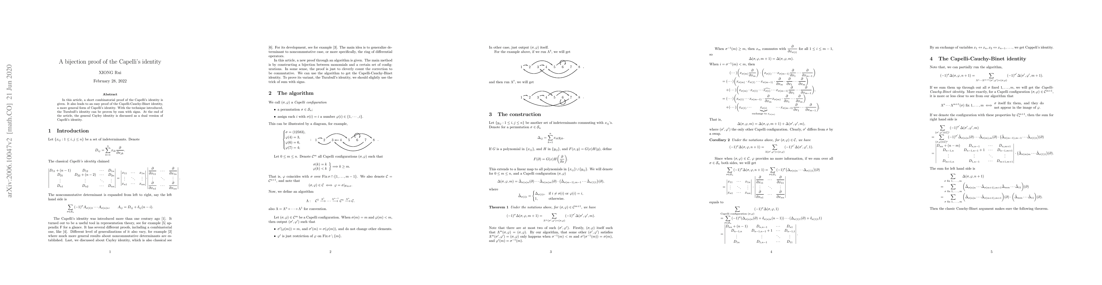 In this article, a short combinatorial proof of the Capelli's identity is given. It also leads to an easy proof of the Capelli--Cauchy--Binet identity, a more general form of Capelli's identity. With the technique introduced, the Turnbull's identity can be proven by sum with signs. At the end of the article, the general Cayley identity is discussed as a dual version of Capelli's identity.