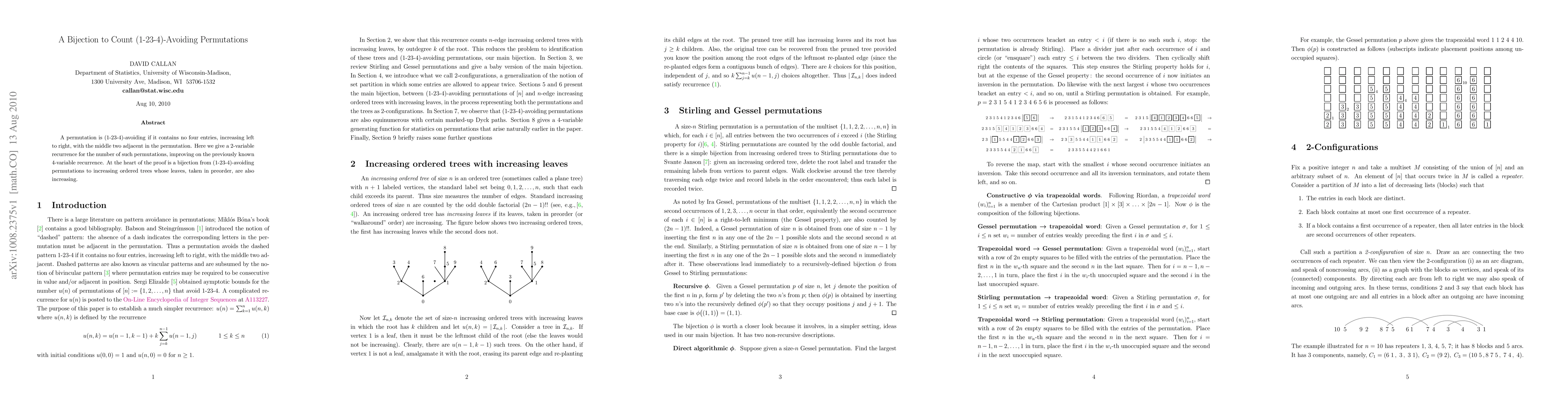 This paper presents a 2-variable recurrence for counting (1-23-4)-avoiding permutations, which avoids the complexity of the previous 4-variable recurrence. The proof leverages a bijection between these permutations and increasing ordered trees with increasing preorder leaf values.
