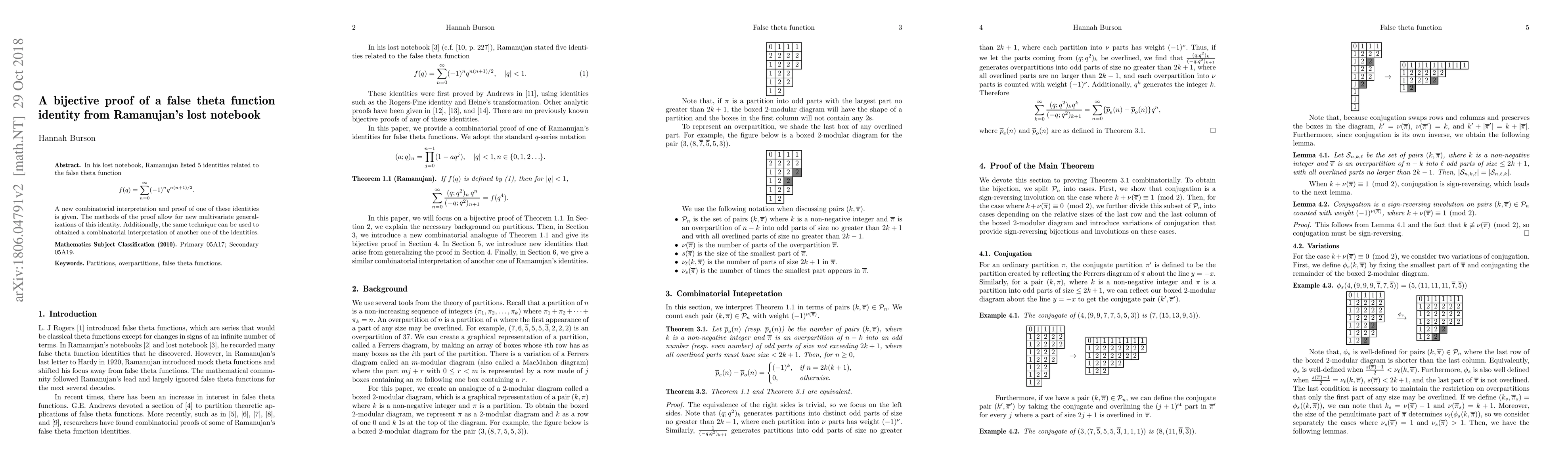 In his lost notebook, Ramanujan listed 5 identities related to the false theta function $$f(q)=\sum_{n=0}^\infty (-1)^nq^{n(n+1)/2}.$$ A new combinatorial interpretation and proof of one of these identities is given. The methods of the proof allow for new multivariate generalizations of this identity. Additionally, the same technique can be used to obtained a combinatorial interpretation of another one of the identities.