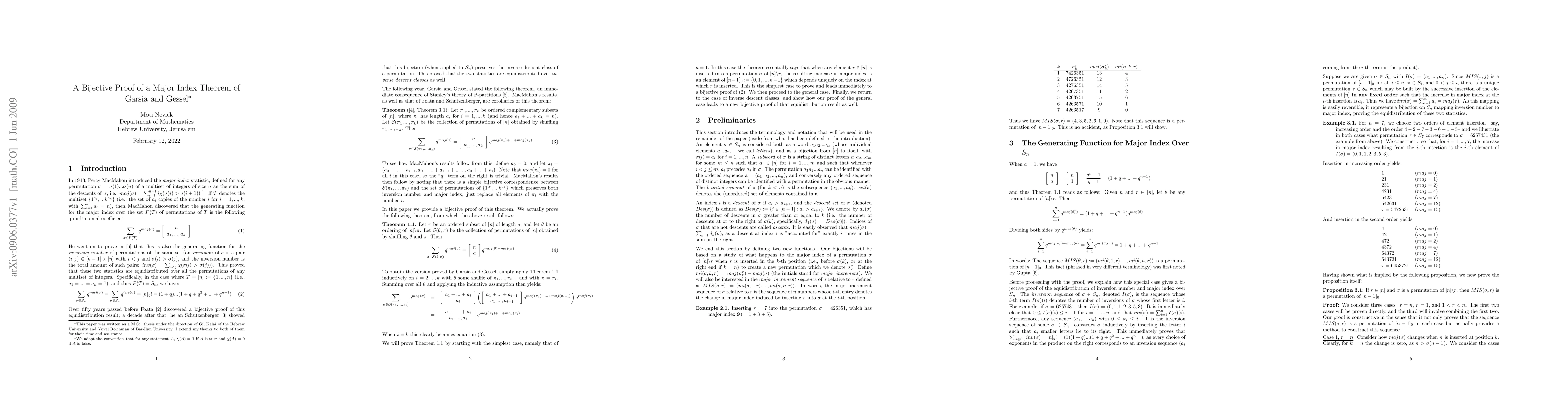 This paper presents a bijective proof for Garsia and Gessel's theorem on the generating function of the major index for permutations that are shuffles of disjoint ordered sequences. It also provides a direct proof for the equidistribution of major index and inversion number, using a bijective approach based on an algorithm for calculating index increases.