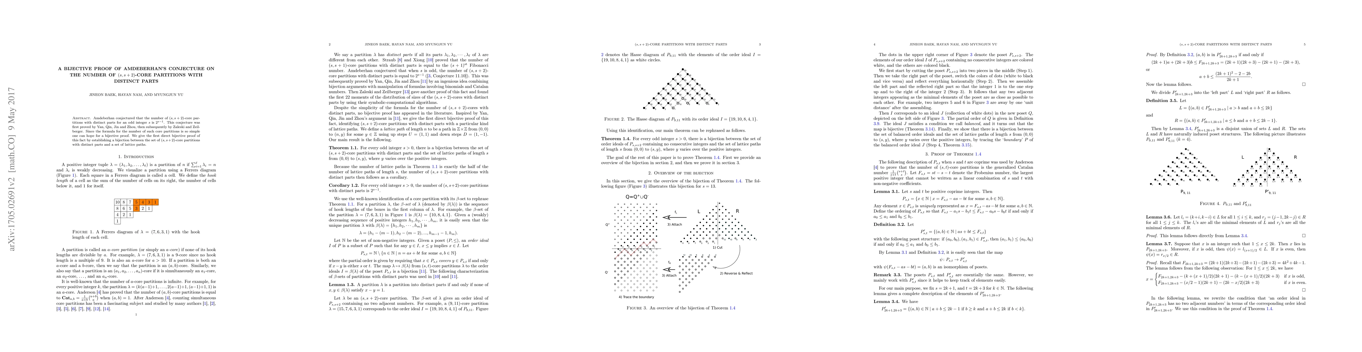 A bijective proof establishes a direct correspondence between $(s, s+2)$-core partitions with distinct parts and lattice paths, confirming Amdeberhan's conjecture that their number is $2^{s-1}$. This provides the first direct bijective proof of the formula for these core partitions.