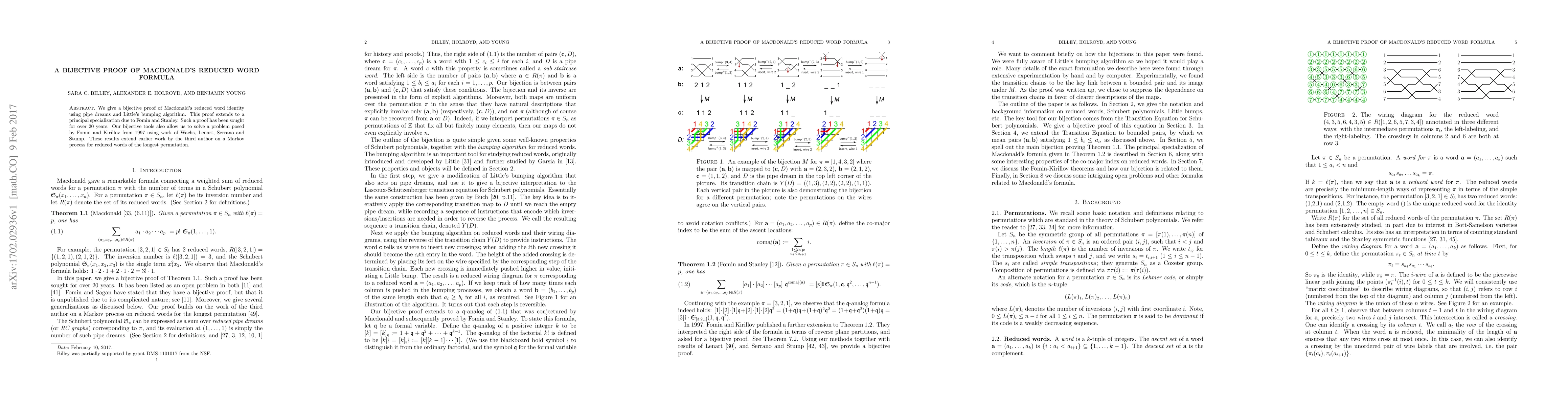 This paper presents a bijective proof of Macdonald's reduced word identity using pipe dreams and Little's bumping algorithm, extending to a principal specialization. It also solves a 1997 problem posed by Fomin and Kirillov using combinatorial tools.