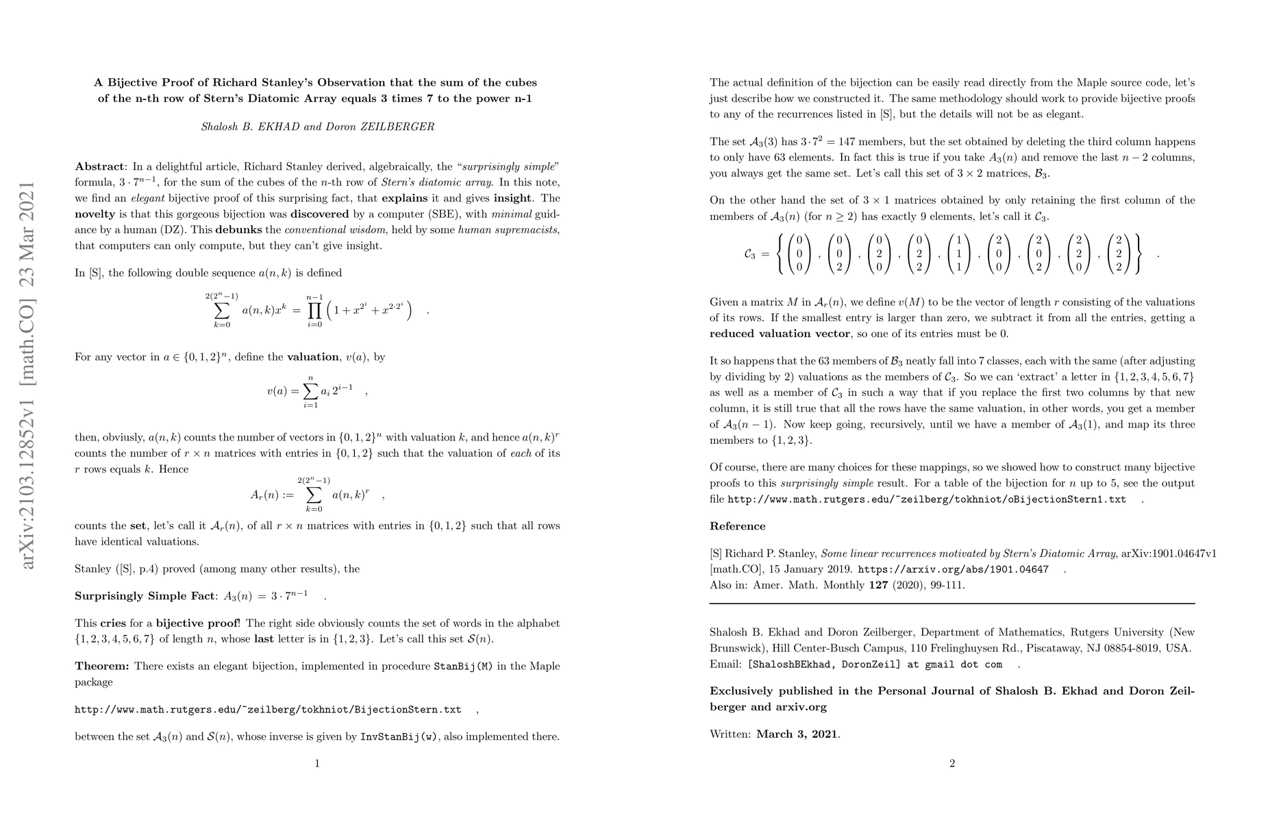 In a delightful article, Richard Stanley derived, algebraically, the surprisingly simple formula, 3 times 7 to the power n-1, for the sum of the cubes of the n-th row of Stern's diatomic array. In this note, we find an elegant bijective proof of this surprising fact, that explains it and gives insight. The novelty is that this gorgeous bijection was discovered by a computer (SBE), with minimal guidance by a human (DZ). This debunks the conventional wisdom, held by some human supremacists, that computers can only compute, but they can't give insight