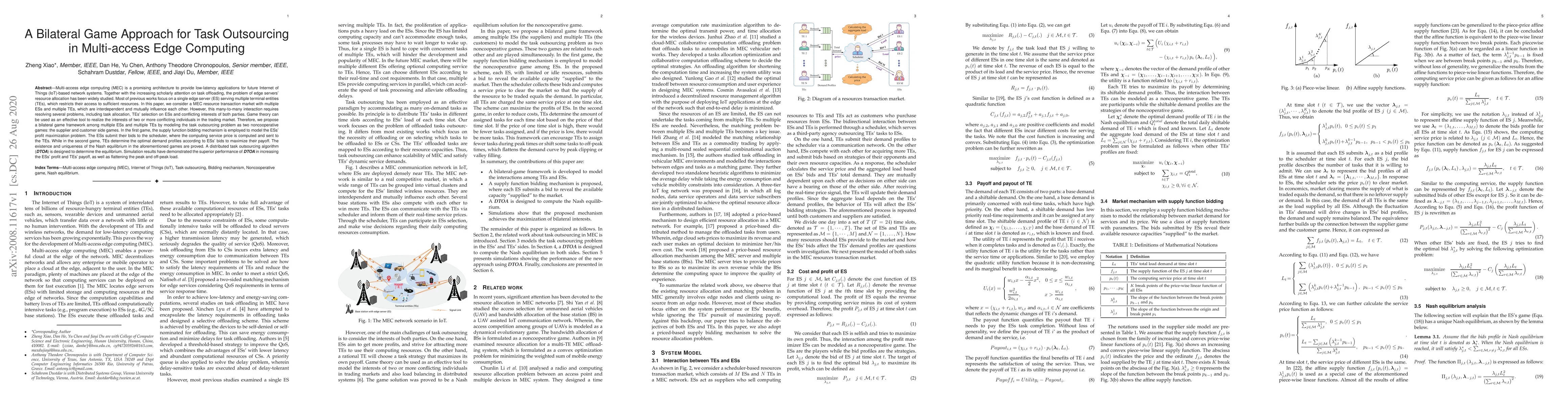 Multi-access edge computing (MEC) is a promising architecture to provide low-latency applications for future Internet of Things (IoT)-based network systems. Together with the increasing scholarly attention on task offloading, the problem of edge servers' resource allocation has been widely studied. Most of previous works focus on a single edge server (ES) serving multiple terminal entities (TEs), which restricts their access to sufficient resources. In this paper, we consider a MEC resource transaction market with multiple ESs and multiple TEs, which are interdependent and mutually influence each other. However, this many-to-many interaction requires resolving several problems, including task allocation, TEs' selection on ESs and conflicting interests of both parties. Game theory can be used as an effective tool to realize the interests of two or more conflicting individuals in the trading market. Therefore, we propose a bilateral game framework among multiple ESs and multiple TEs by modeling the task outsourcing problem as two noncooperative games: the supplier and customer side games. In the first game, the supply function bidding mechanism is employed to model the ESs' profit maximization problem. The ESs submit their bids to the scheduler, where the computing service price is computed and sent to the TEs. While in the second game, TEs determine the optimal demand profiles according to ESs' bids to maximize their payoff. The existence and uniqueness of the Nash equilibrium in the aforementioned games are proved. A distributed task outsourcing algorithm (DTOA) is designed to determine the equilibrium. Simulation results have demonstrated the superior performance of DTOA in increasing the ESs' profit and TEs' payoff, as well as flattening the peak and off-peak load.