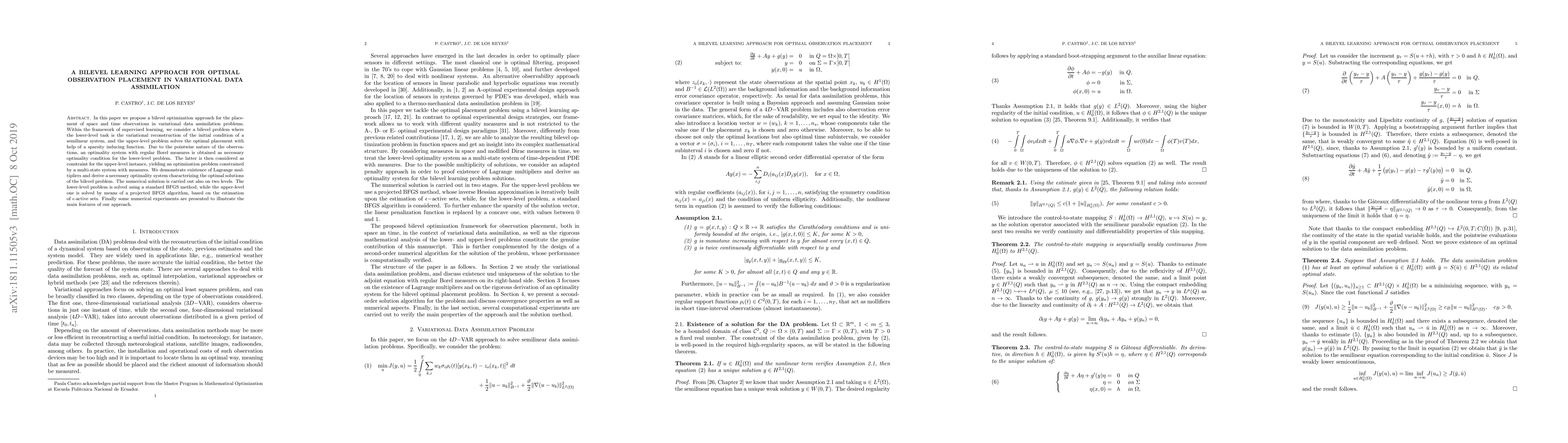 This paper proposes a bilevel optimization approach for optimal observation placement in variational data assimilation, where the lower level reconstructs initial conditions and the upper level optimizes observation placement using sparsity-inducing functions. Numerical solutions involve BFGS methods and projected BFGS for active set estimation, with experiments demonstrating the method's effectiveness.