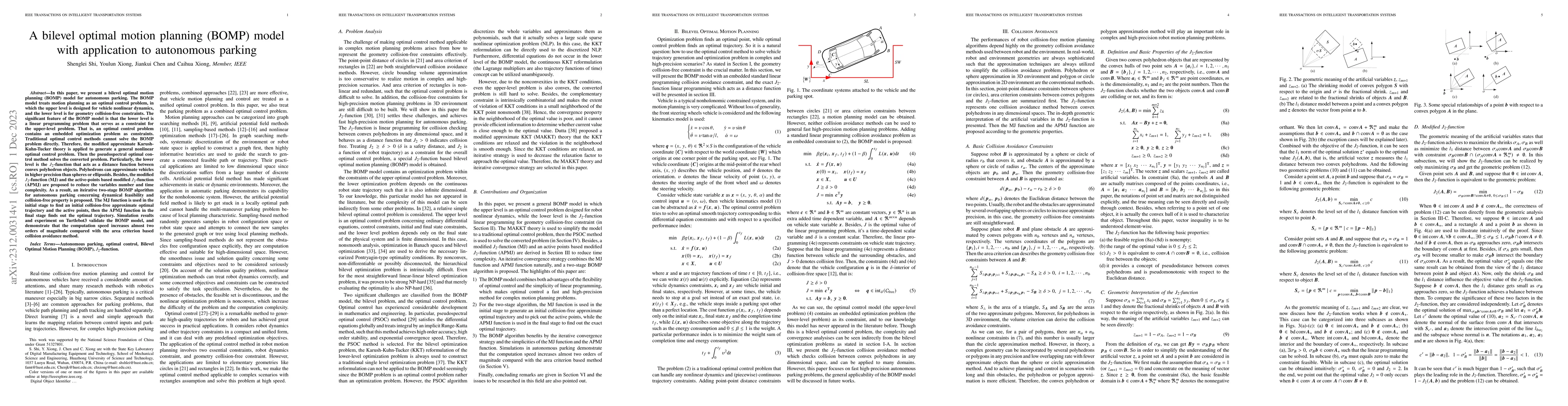 In this paper, we present a bilevel optimal motion planning (BOMP) model for autonomous parking. The BOMP model treats motion planning as an optimal control problem, in which the upper level is designed for vehicle nonlinear dynamics, and the lower level is for geometry collision-free constraints. The significant feature of the BOMP model is that the lower level is a linear programming problem that serves as a constraint for the upper-level problem. That is, an optimal control problem contains an embedded optimization problem as constraints. Traditional optimal control methods cannot solve the BOMP problem directly. Therefore, the modified approximate Karush-Kuhn-Tucker theory is applied to generate a general nonlinear optimal control problem. Then the pseudospectral optimal control method solves the converted problem. Particularly, the lower level is the $J_2$-function that acts as a distance function between convex polyhedron objects. Polyhedrons can approximate vehicles in higher precision than spheres or ellipsoids. Besides, the modified $J_2$-function (MJ) and the active-points based modified $J_2$-function (APMJ) are proposed to reduce the variables number and time complexity. As a result, an iteirative two-stage BOMP algorithm for autonomous parking concerning dynamical feasibility and collision-free property is proposed. The MJ function is used in the initial stage to find an initial collision-free approximate optimal trajectory and the active points, then the APMJ function in the final stage finds out the optimal trajectory. Simulation results and experiment on Turtlebot3 validate the BOMP model, and demonstrate that the computation speed increases almost two orders of magnitude compared with the area criterion based collision avoidance method.
